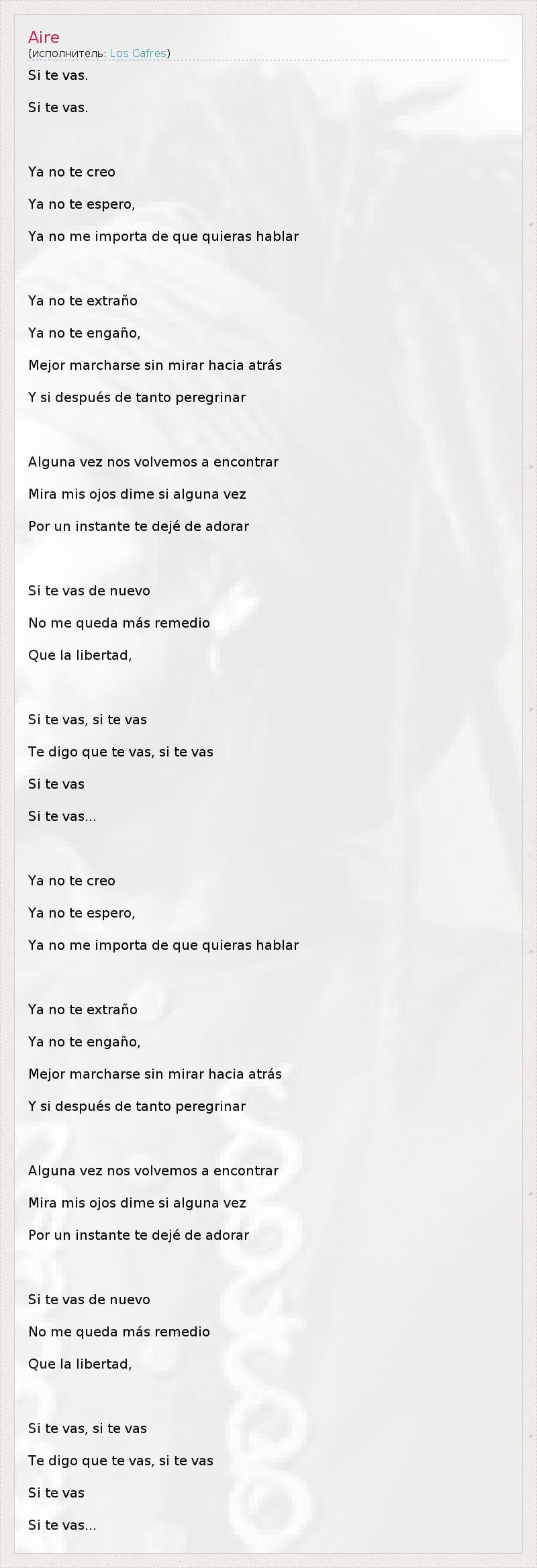 Si te vas. Si te vas. Ya no te creo Ya no te espero, Ya no me importa de que quieras hablar Ya no te extraño Ya no te engaño, Mejor marcharse sin mirar hacia atrás Y si después de tanto peregrinar Alguna vez nos volvemos a encontrar Mira mis ojos dime si alguna vez Por un instante te dejé de adorar Si te vas de nuevo No me queda más remedio Que la libertad, Si te vas, si te vas Te digo que te vas, si te vas Si te vas Si te vas... Ya no te creo Ya no te espero, Ya no me importa de que quieras hablar Ya no te extraño Ya no te engaño, Mejor marcharse sin mirar hacia atrás Y si después de tanto peregrinar Alguna vez nos volvemos a encontrar Mira mis ojos dime si alguna vez Por un instante te dejé de adorar Si te vas de nuevo No me queda más remedio Que la libertad, Si te vas, si te vas Te digo que te vas, si te vas Si te vas Si te vas...