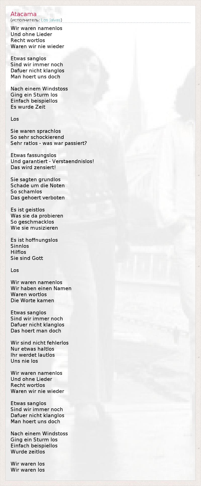 Wir waren namenlos Und ohne Lieder Recht wortlos Waren wir nie wieder Etwas sanglos Sind wir immer noch Dafuer nicht klanglos Man hoert uns doch Nach einem Windstoss Ging ein Sturm los Einfach beispiellos Es wurde Zeit Los Sie waren sprachlos So sehr schockierend Sehr ratlos - was war passiert? Etwas fassungslos Und garantiert - Verstaendnislos! Das wird zensiert! Sie sagten grundlos Schade um die Noten So schamlos Das gehoert verboten Es ist geistlos Was sie da probieren So geschmacklos Wie sie musizieren Es ist hoffnungslos Sinnlos Hilflos Sie sind Gott Los Wir waren namenlos Wir haben einen Namen Waren wortlos Die Worte kamen Etwas sanglos Sind wir immer noch Dafuer nicht klanglos Das hoert man doch Wir sind nicht fehlerlos Nur etwas haltlos Ihr werdet lautlos Uns nie los Wir waren namenlos Und ohne Lieder Recht wortlos Waren wir nie wieder Etwas sanglos Sind wir immer noch Dafuer nicht klanglos Man hoert uns doch Nach einem Windstoss Ging ein Sturm los Einfach beispiellos Wurde zeitlos Wir waren los Wir waren los