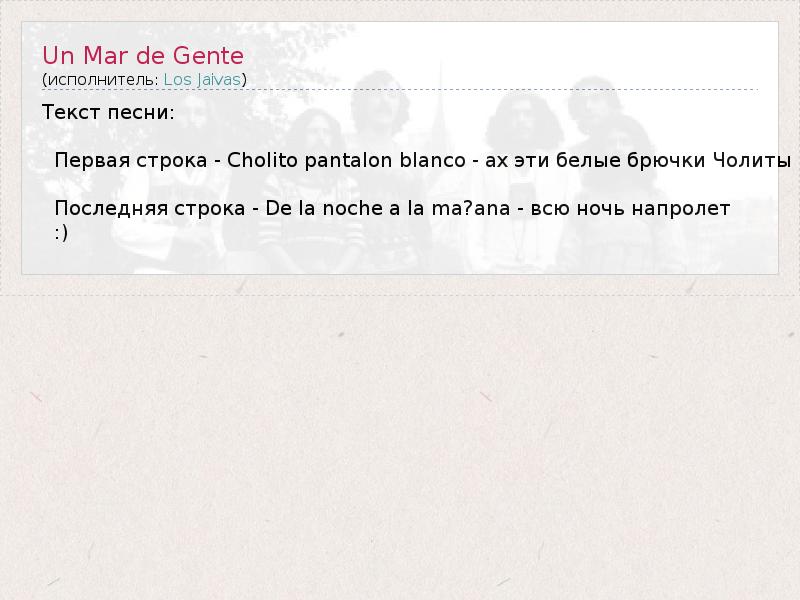 Текст песни: Первая строка - Cholito pantalon blanco - ах эти белые брючки Чолиты Последняя строка - De la noche a la ma?ana - всю ночь напролет :)