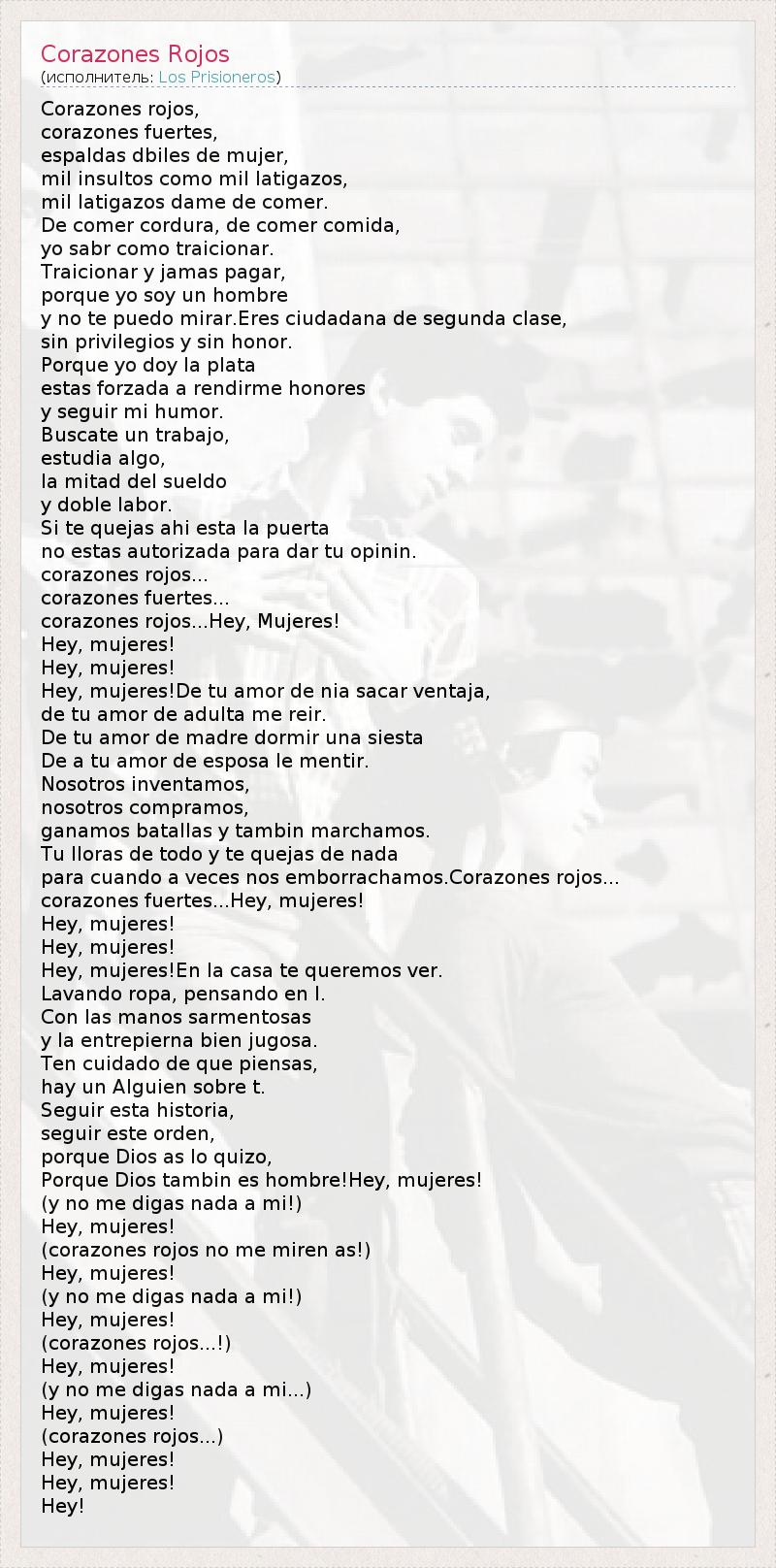 Corazones rojos, corazones fuertes, espaldas dbiles de mujer, mil insultos como mil latigazos, mil latigazos dame de comer. De comer cordura, de comer comida, yo sabr como traicionar. Traicionar y jamas pagar, porque yo soy un hombre y no te puedo mirar.Eres ciudadana de segunda clase, sin privilegios y sin honor. Porque yo doy la plata estas forzada a rendirme honores y seguir mi humor. Buscate un trabajo, estudia algo, la mitad del sueldo y doble labor. Si te quejas ahi esta la puerta no estas autorizada para dar tu opinin. corazones rojos... corazones fuertes... corazones rojos...Hey, Mujeres! Hey, mujeres! Hey, mujeres! Hey, mujeres!De tu amor de nia sacar ventaja, de tu amor de adulta me reir. De tu amor de madre dormir una siesta De a tu amor de esposa le mentir. Nosotros inventamos, nosotros compramos, ganamos batallas y tambin marchamos. Tu lloras de todo y te quejas de nada para cuando a veces nos emborrachamos.Corazones rojos... corazones fuertes...Hey, mujeres! Hey, mujeres! Hey, mujeres! Hey, mujeres!En la casa te queremos ver. Lavando ropa, pensando en l. Con las manos sarmentosas y la entrepierna bien jugosa. Ten cuidado de que piensas, hay un Alguien sobre t. Seguir esta historia, seguir este orden, porque Dios as lo quizo, Porque Dios tambin es hombre!Hey, mujeres! (y no me digas nada a mi!) Hey, mujeres! (corazones rojos no me miren as!) Hey, mujeres! (y no me digas nada a mi!) Hey, mujeres! (corazones rojos...!) Hey, mujeres! (y no me digas nada a mi...) Hey, mujeres! (corazones rojos...) Hey, mujeres! Hey, mujeres! Hey!