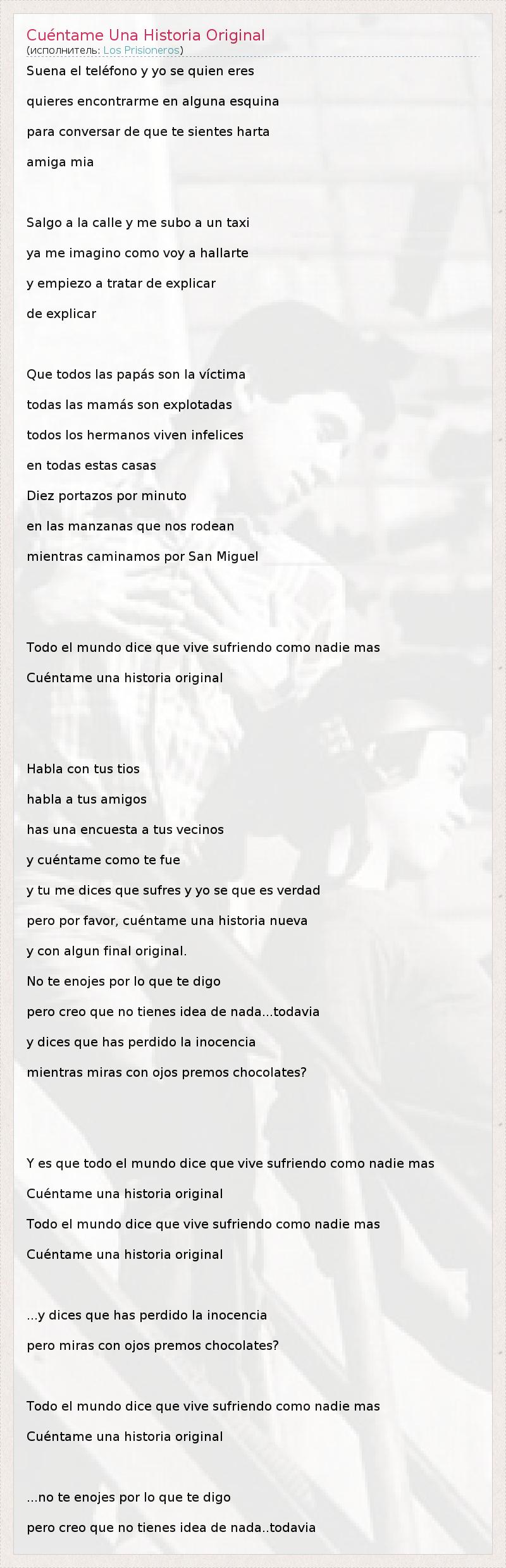 Suena el teléfono y yo se quien eres quieres encontrarme en alguna esquina para conversar de que te sientes harta amiga mia Salgo a la calle y me subo a un taxi ya me imagino como voy a hallarte y empiezo a tratar de explicar de explicar Que todos las papás son la víctima todas las mamás son explotadas todos los hermanos viven infelices en todas estas casas Diez portazos por minuto en las manzanas que nos rodean mientras caminamos por San Miguel Todo el mundo dice que vive sufriendo como nadie mas Cuéntame una historia original Habla con tus tios habla a tus amigos has una encuesta a tus vecinos y cuéntame como te fue y tu me dices que sufres y yo se que es verdad pero por favor, cuéntame una historia nueva y con algun final original. No te enojes por lo que te digo pero creo que no tienes idea de nada...todavia y dices que has perdido la inocencia mientras miras con ojos premos chocolates? Y es que todo el mundo dice que vive sufriendo como nadie mas Cuéntame una historia original Todo el mundo dice que vive sufriendo como nadie mas Cuéntame una historia original ...y dices que has perdido la inocencia pero miras con ojos premos chocolates? Todo el mundo dice que vive sufriendo como nadie mas Cuéntame una historia original ...no te enojes por lo que te digo pero creo que no tienes idea de nada..todavia