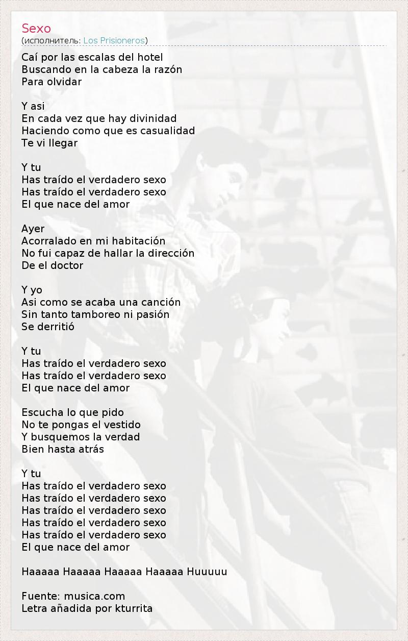 Caí por las escalas del hotel Buscando en la cabeza la razón Para olvidar Y asi En cada vez que hay divinidad Haciendo como que es casualidad Te vi llegar Y tu Has traído el verdadero sexo Has traído el verdadero sexo El que nace del amor Ayer Acorralado en mi habitación No fui capaz de hallar la dirección De el doctor Y yo Asi como se acaba una canción Sin tanto tamboreo ni pasión Se derritió Y tu Has traído el verdadero sexo Has traído el verdadero sexo El que nace del amor Escucha lo que pido No te pongas el vestido Y busquemos la verdad Bien hasta atrás Y tu Has traído el verdadero sexo Has traído el verdadero sexo Has traído el verdadero sexo Has traído el verdadero sexo Has traído el verdadero sexo El que nace del amor Haaaaa Haaaaa Haaaaa Haaaaa Huuuuu Fuente: musica.com Letra añadida por kturrita
