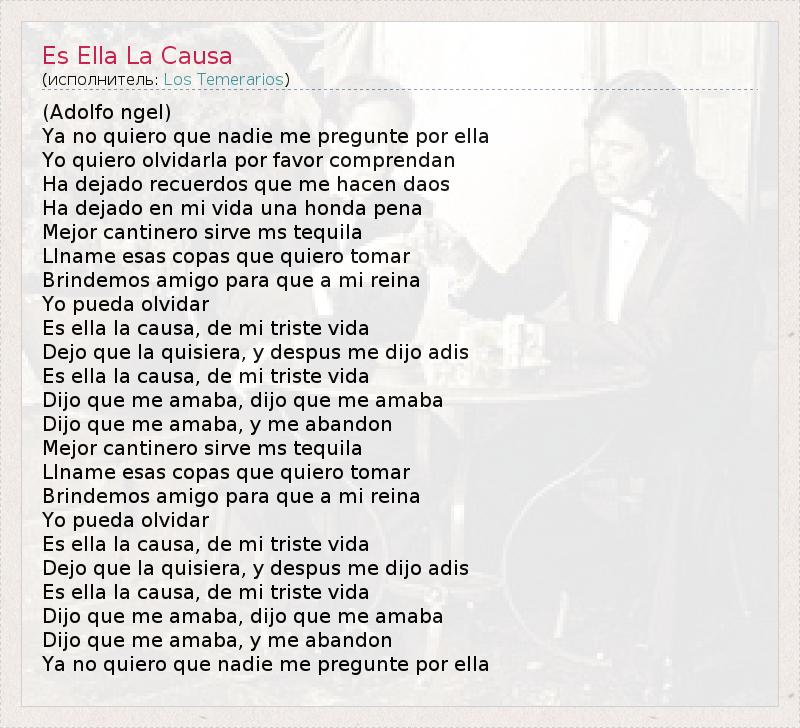 (Adolfo ngel) Ya no quiero que nadie me pregunte por ella Yo quiero olvidarla por favor comprendan Ha dejado recuerdos que me hacen daos Ha dejado en mi vida una honda pena Mejor cantinero sirve ms tequila Llname esas copas que quiero tomar Brindemos amigo para que a mi reina Yo pueda olvidar Es ella la causa, de mi triste vida Dejo que la quisiera, y despus me dijo adis Es ella la causa, de mi triste vida Dijo que me amaba, dijo que me amaba Dijo que me amaba, y me abandon Mejor cantinero sirve ms tequila Llname esas copas que quiero tomar Brindemos amigo para que a mi reina Yo pueda olvidar Es ella la causa, de mi triste vida Dejo que la quisiera, y despus me dijo adis Es ella la causa, de mi triste vida Dijo que me amaba, dijo que me amaba Dijo que me amaba, y me abandon Ya no quiero que nadie me pregunte por ella