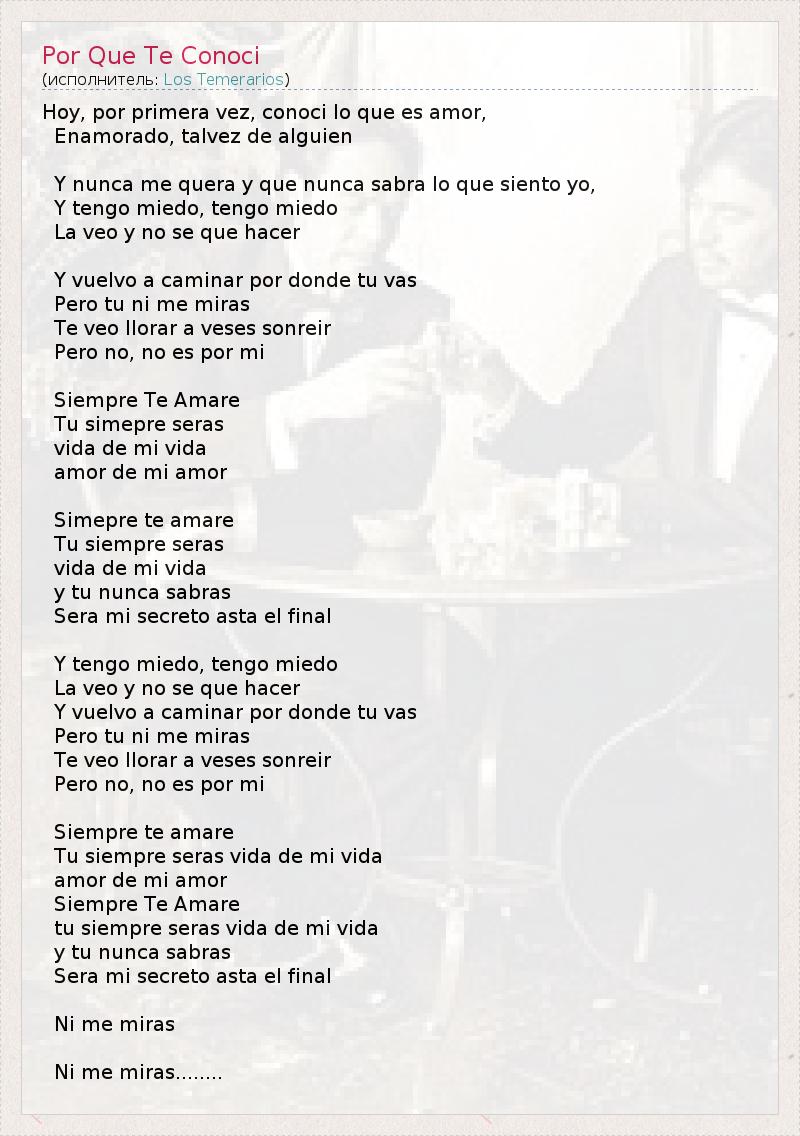 Hoy, por primera vez, conoci lo que es amor, Enamorado, talvez de alguien Y nunca me quera y que nunca sabra lo que siento yo, Y tengo miedo, tengo miedo La veo y no se que hacer Y vuelvo a caminar por donde tu vas Pero tu ni me miras Te veo llorar a veses sonreir Pero no, no es por mi Siempre Te Amare Tu simepre seras vida de mi vida amor de mi amor Simepre te amare Tu siempre seras vida de mi vida y tu nunca sabras Sera mi secreto asta el final Y tengo miedo, tengo miedo La veo y no se que hacer Y vuelvo a caminar por donde tu vas Pero tu ni me miras Te veo llorar a veses sonreir Pero no, no es por mi Siempre te amare Tu siempre seras vida de mi vida amor de mi amor Siempre Te Amare tu siempre seras vida de mi vida y tu nunca sabras Sera mi secreto asta el final Ni me miras Ni me miras........