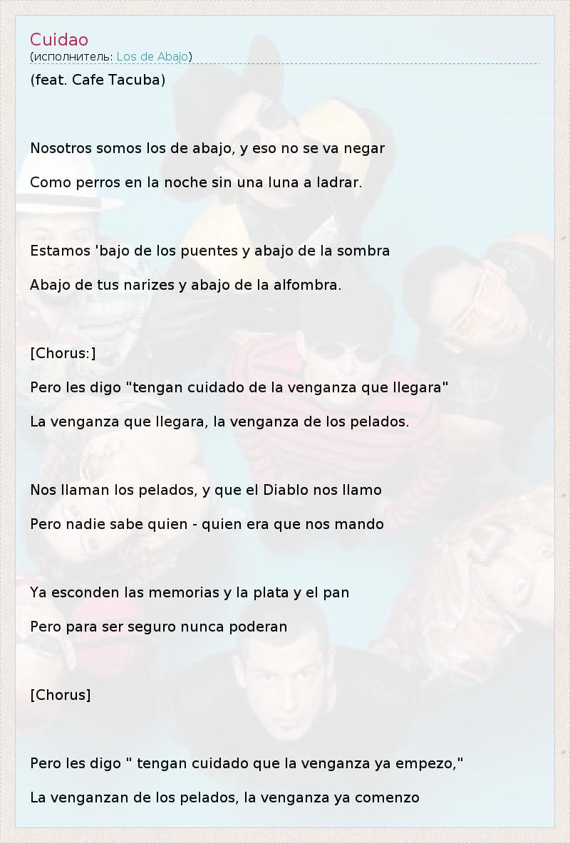 (feat. Cafe Tacuba) Nosotros somos los de abajo, y eso no se va negar Como perros en la noche sin una luna a ladrar. Estamos 'bajo de los puentes y abajo de la sombra Abajo de tus narizes y abajo de la alfombra. [Chorus:] Pero les digo "tengan cuidado de la venganza que llegara" La venganza que llegara, la venganza de los pelados. Nos llaman los pelados, y que el Diablo nos llamo Pero nadie sabe quien - quien era que nos mando Ya esconden las memorias y la plata y el pan Pero para ser seguro nunca poderan [Chorus] Pero les digo " tengan cuidado que la venganza ya empezo," La venganzan de los pelados, la venganza ya comenzo