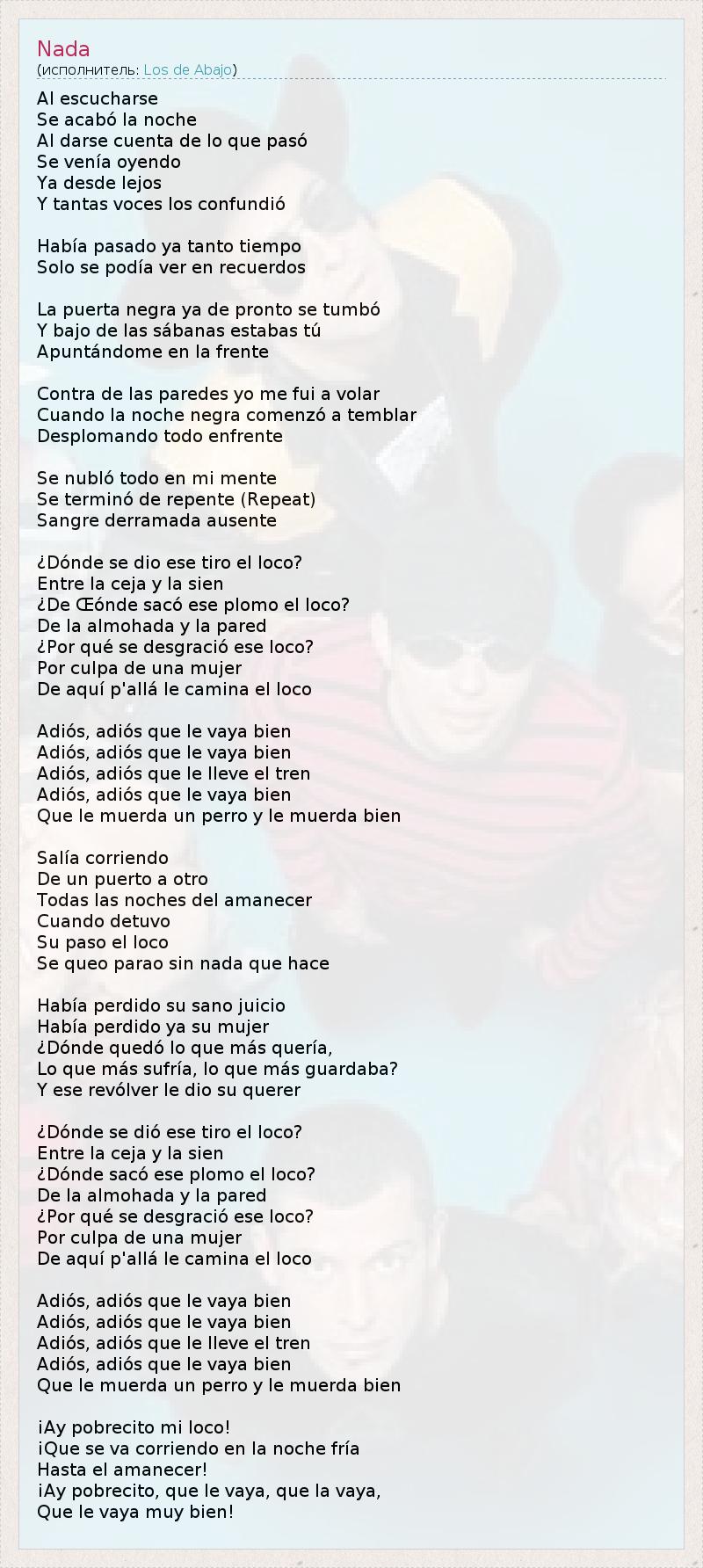 Аль escucharse Се ля acabó ночь Аль Darse Cuenta де ло Que Пасо Се Веня oyendo Я. Цена от Lejos У tantas Voces лос confundió Habia Pasado Я. танто Tiempo Соло себе ножек версии ан Recuerdos La Puerta Negra я-де-Пронто себе Tumbo У Бахо-де-лас sábanas estabas tú Apuntándome ан ла Фронт Противопоказания де-лас-Паредес лет мне Fui в ладонной Cuando ла ночь Negra comenzó temblar Desplomando TODO Enfrente Се Nublo TODO EN миль Менте Се terminó де repente (повтор) Sangre derramada ausente ¿Dónde себе Dio ESE Тирон El Loco? Entre-ла-ла-Ceja у Син ¿De Œónde Сако ESE Plomo El Loco? Де ла ла Almohada у сравнению ¿Por qué себе desgració ESE Локо? Пор-де-уна кульпа Mujer Де aquí p'allá ле camina El Loco Adiós, Adiós Que ле вайя Bien Adiós, Adiós Que ле вайя Bien Adiós, Adiós Que ле lleve эль трен Adiós, Adiós Que ле вайя Bien Que ле muerda ООН Перро у ле muerda Bien Салия corriendo Де ООН Пуэрто Otro Тода лас Noches дель Amanecer Cuando detuvo Су-Пасо El Loco Се queo Parao грех нада Que HACE Habia Пердидо су Сано juicio Habia Пердидо я су Mujer ¿Dónde quedó вот Que más quería, Ло дие más sufría вот Que más guardaba? У ESE револьвер ле Dio су querer ¿Dónde себе Dio ESE Тирон El Loco? Entre-ла-ла-Ceja у Син ¿Dónde Сако ESE Plomo El Loco? Де ла ла Almohada у сравнению ¿Por qué себе desgració ESE Локо? Пор-де-уна кульпа Mujer Де aquí p'allá ле camina El Loco Adiós, Adiós Que ле вайя Bien Adiós, Adiós Que ле вайя Bien Adiós, Adiós Que ле lleve эль трен Adiós, Adiós Que ле вайя Bien Que ле muerda ООН Перро у ле muerda Bien ¡Ay pobrecito миль Локо! ¡Que SE ва corriendo ан ла ночь FRIA Hasta эль Amanecer! ¡Ay pobrecito, Que ле вайя, Que ла вайя, Que ле вайя Muy Bien!