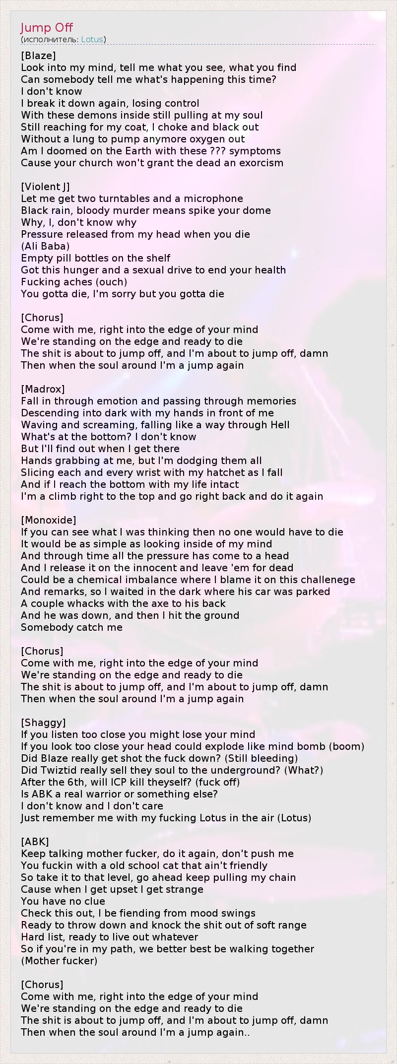 [Blaze] Look into my mind, tell me what you see, what you find Can somebody tell me what's happening this time? I don't know I break it down again, losing control With these demons inside still pulling at my soul Still reaching for my coat, I choke and black out Without a lung to pump anymore oxygen out Am I doomed on the Earth with these ??? symptoms Cause your church won't grant the dead an exorcism [Violent J] Let me get two turntables and a microphone Black rain, bloody murder means spike your dome Why, I, don't know why Pressure released from my head when you die (Ali Baba) Empty pill bottles on the shelf Got this hunger and a sexual drive to end your health Fucking aches (ouch) You gotta die, I'm sorry but you gotta die [Chorus] Come with me, right into the edge of your mind We're standing on the edge and ready to die The shit is about to jump off, and I'm about to jump off, damn Then when the soul around I'm a jump again [Madrox] Fall in through emotion and passing through memories Descending into dark with my hands in front of me Waving and screaming, falling like a way through Hell What's at the bottom? I don't know But I'll find out when I get there Hands grabbing at me, but I'm dodging them all Slicing each and every wrist with my hatchet as I fall And if I reach the bottom with my life intact I'm a climb right to the top and go right back and do it again [Monoxide] If you can see what I was thinking then no one would have to die It would be as simple as looking inside of my mind And through time all the pressure has come to a head And I release it on the innocent and leave 'em for dead Could be a chemical imbalance where I blame it on this challenege And remarks, so I waited in the dark where his car was parked A couple whacks with the axe to his back And he was down, and then I hit the ground Somebody catch me [Chorus] Come with me, right into the edge of your mind We're standing on the edge and ready to die The shit is about to jump off, and I'm about to jump off, damn Then when the soul around I'm a jump again [Shaggy] If you listen too close you might lose your mind If you look too close your head could explode like mind bomb (boom) Did Blaze really get shot the fuck down? (Still bleeding) Did Twiztid really sell they soul to the underground? (What?) After the 6th, will ICP kill theyself? (fuck off) Is ABK a real warrior or something else? I don't know and I don't care Just remember me with my fucking Lotus in the air (Lotus) [ABK] Keep talking mother fucker, do it again, don't push me You fuckin with a old school cat that ain't friendly So take it to that level, go ahead keep pulling my chain Cause when I get upset I get strange You have no clue Check this out, I be fiending from mood swings Ready to throw down and knock the shit out of soft range Hard list, ready to live out whatever So if you're in my path, we better best be walking together (Mother fucker) [Chorus] Come with me, right into the edge of your mind We're standing on the edge and ready to die The shit is about to jump off, and I'm about to jump off, damn Then when the soul around I'm a jump again..