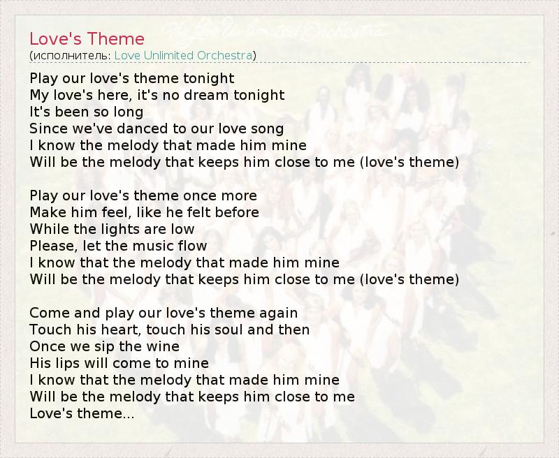 Play our love's theme tonight My love's here, it's no dream tonight It's been so long Since we've danced to our love song I know the melody that made him mine Will be the melody that keeps him close to me (love's theme) Play our love's theme once more Make him feel, like he felt before While the lights are low Please, let the music flow I know that the melody that made him mine Will be the melody that keeps him close to me (love's theme) Come and play our love's theme again Touch his heart, touch his soul and then Once we sip the wine His lips will come to mine I know that the melody that made him mine Will be the melody that keeps him close to me Love's theme...