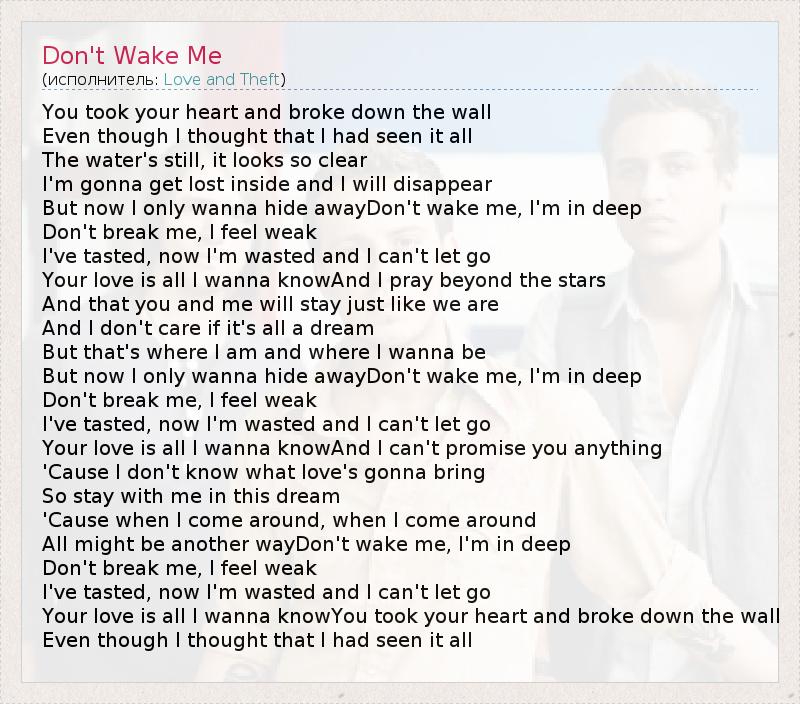 You took your heart and broke down the wall Even though I thought that I had seen it all The water's still, it looks so clear I'm gonna get lost inside and I will disappear But now I only wanna hide awayDon't wake me, I'm in deep Don't break me, I feel weak I've tasted, now I'm wasted and I can't let go Your love is all I wanna knowAnd I pray beyond the stars And that you and me will stay just like we are And I don't care if it's all a dream But that's where I am and where I wanna be But now I only wanna hide awayDon't wake me, I'm in deep Don't break me, I feel weak I've tasted, now I'm wasted and I can't let go Your love is all I wanna knowAnd I can't promise you anything 'Cause I don't know what love's gonna bring So stay with me in this dream 'Cause when I come around, when I come around All might be another wayDon't wake me, I'm in deep Don't break me, I feel weak I've tasted, now I'm wasted and I can't let go Your love is all I wanna knowYou took your heart and broke down the wall Even though I thought that I had seen it all