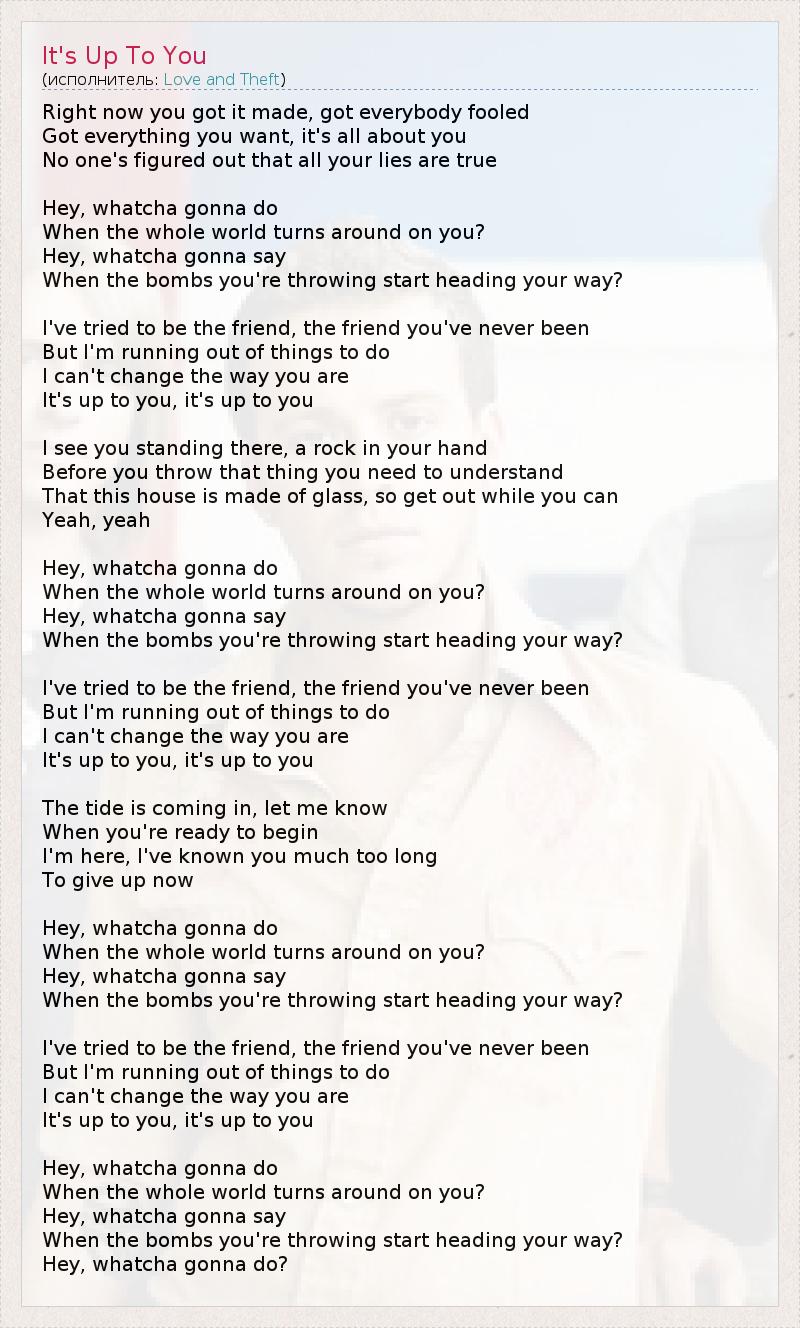 Right now you got it made, got everybody fooled Got everything you want, it's all about you No one's figured out that all your lies are true Hey, whatcha gonna do When the whole world turns around on you? Hey, whatcha gonna say When the bombs you're throwing start heading your way? I've tried to be the friend, the friend you've never been But I'm running out of things to do I can't change the way you are It's up to you, it's up to you I see you standing there, a rock in your hand Before you throw that thing you need to understand That this house is made of glass, so get out while you can Yeah, yeah Hey, whatcha gonna do When the whole world turns around on you? Hey, whatcha gonna say When the bombs you're throwing start heading your way? I've tried to be the friend, the friend you've never been But I'm running out of things to do I can't change the way you are It's up to you, it's up to you The tide is coming in, let me know When you're ready to begin I'm here, I've known you much too long To give up now Hey, whatcha gonna do When the whole world turns around on you? Hey, whatcha gonna say When the bombs you're throwing start heading your way? I've tried to be the friend, the friend you've never been But I'm running out of things to do I can't change the way you are It's up to you, it's up to you Hey, whatcha gonna do When the whole world turns around on you? Hey, whatcha gonna say When the bombs you're throwing start heading your way? Hey, whatcha gonna do?