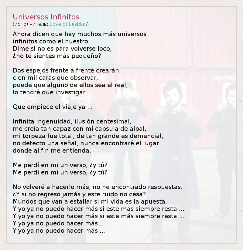 Ahora dicen que hay muchos más universos infinitos como el nuestro. Dime si no es para volverse loco, ¿no te sientes más pequeño? Dos espejos frente a frente crearán cien mil caras que observar, puede que alguno de ellos sea el real, lo tendré que investigar. Que empiece el viaje ya ... Infinita ingenuidad, ilusión centesimal, me creía tan capaz con mi capsula de albal, mi torpeza fue total, de tan grande es demencial, no detecto una señal, nunca encontraré el lugar donde al fin me entienda. Me perdí en mi universo, ¿y tú? Me perdí en mi universo, ¿y tú? No volveré a hacerlo más, no he encontrado respuestas. ¿Y si no regreso jamás y este ruido no cesa? Mundos que van a estallar si mi vida es la apuesta. Y yo ya no puedo hacer más si este más siempre resta ... Y yo ya no puedo hacer más si este más siempre resta ... Y yo ya no puedo hacer más ... Y yo ya no puedo hacer más ...
