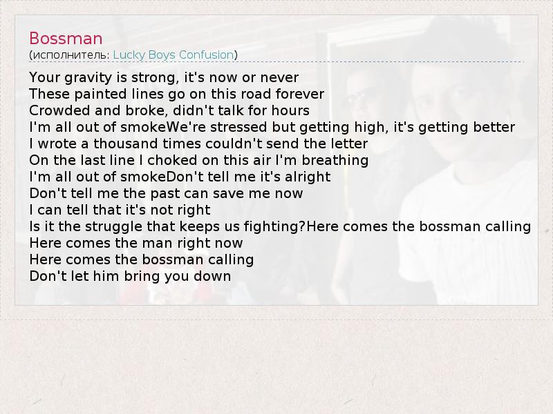 Your gravity is strong, it's now or never These painted lines go on this road forever Crowded and broke, didn't talk for hours I'm all out of smokeWe're stressed but getting high, it's getting better I wrote a thousand times couldn't send the letter On the last line I choked on this air I'm breathing I'm all out of smokeDon't tell me it's alright Don't tell me the past can save me now I can tell that it's not right Is it the struggle that keeps us fighting?Here comes the bossman calling Here comes the man right now Here comes the bossman calling Don't let him bring you down