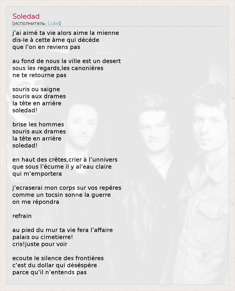 j'ai aimé ta vie alors aime la mienne dis-le à cette âme qui décéde que l'on en reviens pas au fond de nous la ville est un desert sous les regards,les canoniéres ne te retourne pas souris ou saigne souris aux drames la tête en arriére soledad! brise les hommes souris aux drames la tête en arriére soledad! en haut des crêtes,crier à l'unnivers que sous l'écume il y al'eau claire qui m'emportera j'ecraserai mon corps sur vos repéres comme un tocsin sonne la guerre on me répondra refrain au pied du mur ta vie fera l'affaire palais ou cimetierre! cris!juste pour voir ecoute le silence des frontiéres c'est du dollar qui déséspére parce qu'il n'entends pas