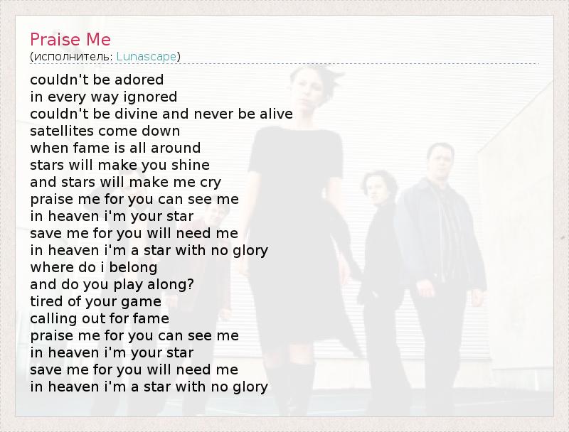 couldn't be adored in every way ignored couldn't be divine and never be alive satellites come down when fame is all around stars will make you shine and stars will make me cry praise me for you can see me in heaven i'm your star save me for you will need me in heaven i'm a star with no glory where do i belong and do you play along? tired of your game calling out for fame praise me for you can see me in heaven i'm your star save me for you will need me in heaven i'm a star with no glory