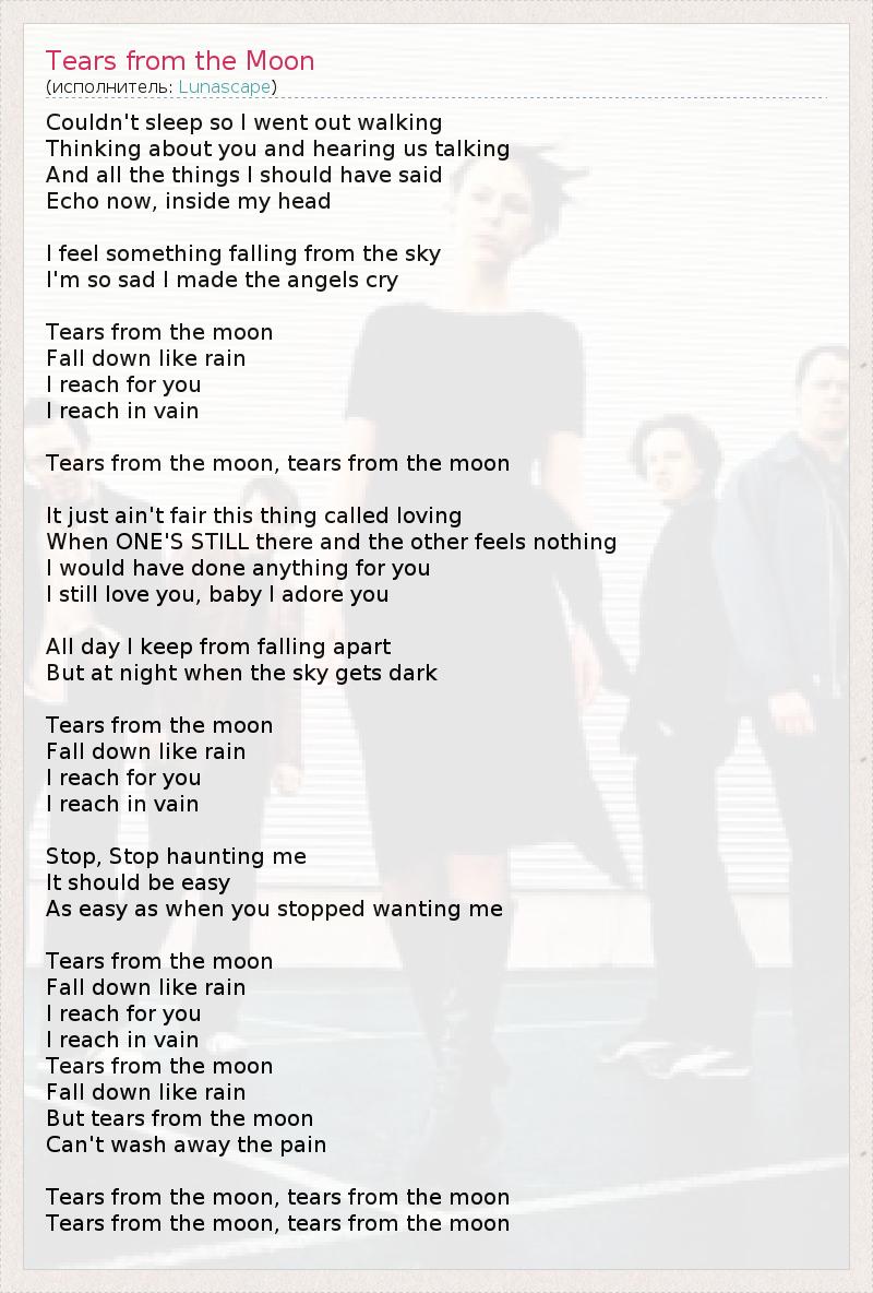 Couldn't sleep so I went out walking Thinking about you and hearing us talking And all the things I should have said Echo now, inside my head I feel something falling from the sky I'm so sad I made the angels cry Tears from the moon Fall down like rain I reach for you I reach in vain Tears from the moon, tears from the moon It just ain't fair this thing called loving When ONE'S STILL there and the other feels nothing I would have done anything for you I still love you, baby I adore you All day I keep from falling apart But at night when the sky gets dark Tears from the moon Fall down like rain I reach for you I reach in vain Stop, Stop haunting me It should be easy As easy as when you stopped wanting me Tears from the moon Fall down like rain I reach for you I reach in vain Tears from the moon Fall down like rain But tears from the moon Can't wash away the pain Tears from the moon, tears from the moon Tears from the moon, tears from the moon