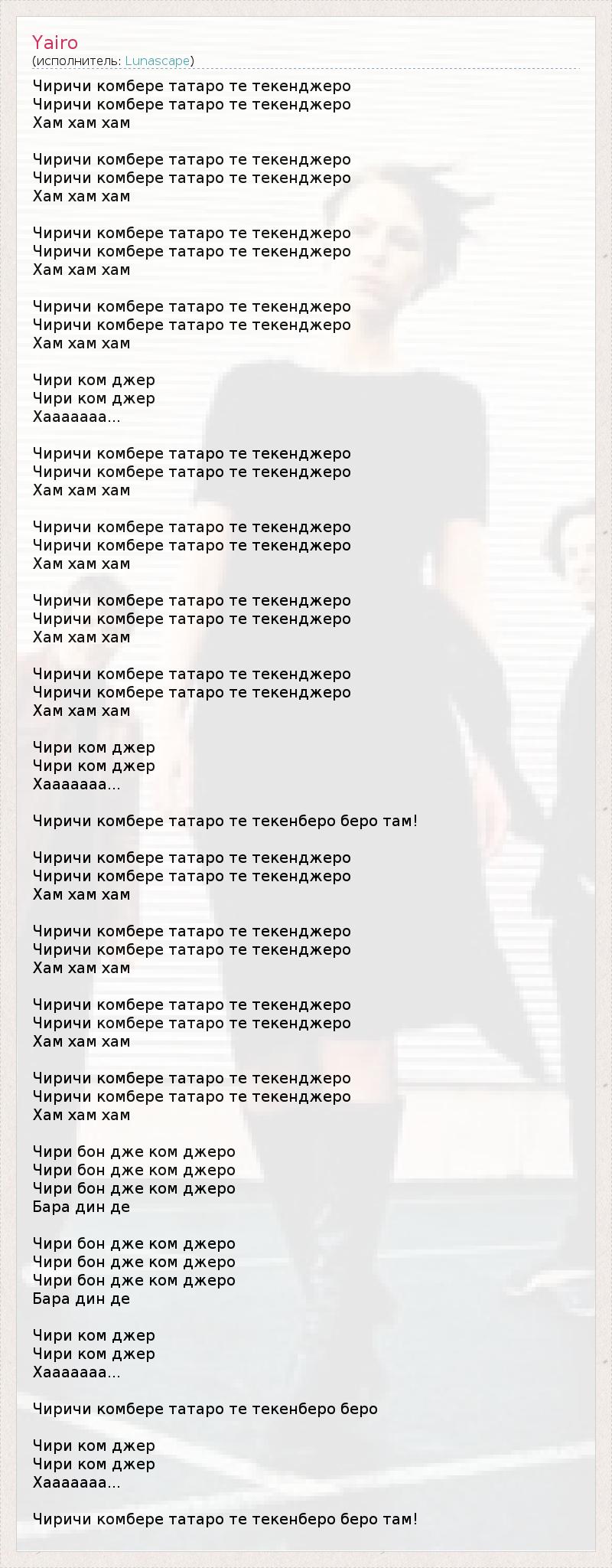 Чиричи комбере татаро те текенджеро Чиричи комбере татаро те текенджеро Хам хам хам Чиричи комбере татаро те текенджеро Чиричи комбере татаро те текенджеро Хам хам хам Чиричи комбере татаро те текенджеро Чиричи комбере татаро те текенджеро Хам хам хам Чиричи комбере татаро те текенджеро Чиричи комбере татаро те текенджеро Хам хам хам Чири ком джер Чири ком джер Хааааааа... Чиричи комбере татаро те текенджеро Чиричи комбере татаро те текенджеро Хам хам хам Чиричи комбере татаро те текенджеро Чиричи комбере татаро те текенджеро Хам хам хам Чиричи комбере татаро те текенджеро Чиричи комбере татаро те текенджеро Хам хам хам Чиричи комбере татаро те текенджеро Чиричи комбере татаро те текенджеро Хам хам хам Чири ком джер Чири ком джер Хааааааа... Чиричи комбере татаро те текенберо беро там! Чиричи комбере татаро те текенджеро Чиричи комбере татаро те текенджеро Хам хам хам Чиричи комбере татаро те текенджеро Чиричи комбере татаро те текенджеро Хам хам хам Чиричи комбере татаро те текенджеро Чиричи комбере татаро те текенджеро Хам хам хам Чиричи комбере татаро те текенджеро Чиричи комбере татаро те текенджеро Хам хам хам Чири бон дже ком джеро Чири бон дже ком джеро Чири бон дже ком джеро Бара дин де Чири бон дже ком джеро Чири бон дже ком джеро Чири бон дже ком джеро Бара дин де Чири ком джер Чири ком джер Хааааааа... Чиричи комбере татаро те текенберо беро Чири ком джер Чири ком джер Хааааааа... Чиричи комбере татаро те текенберо беро там!