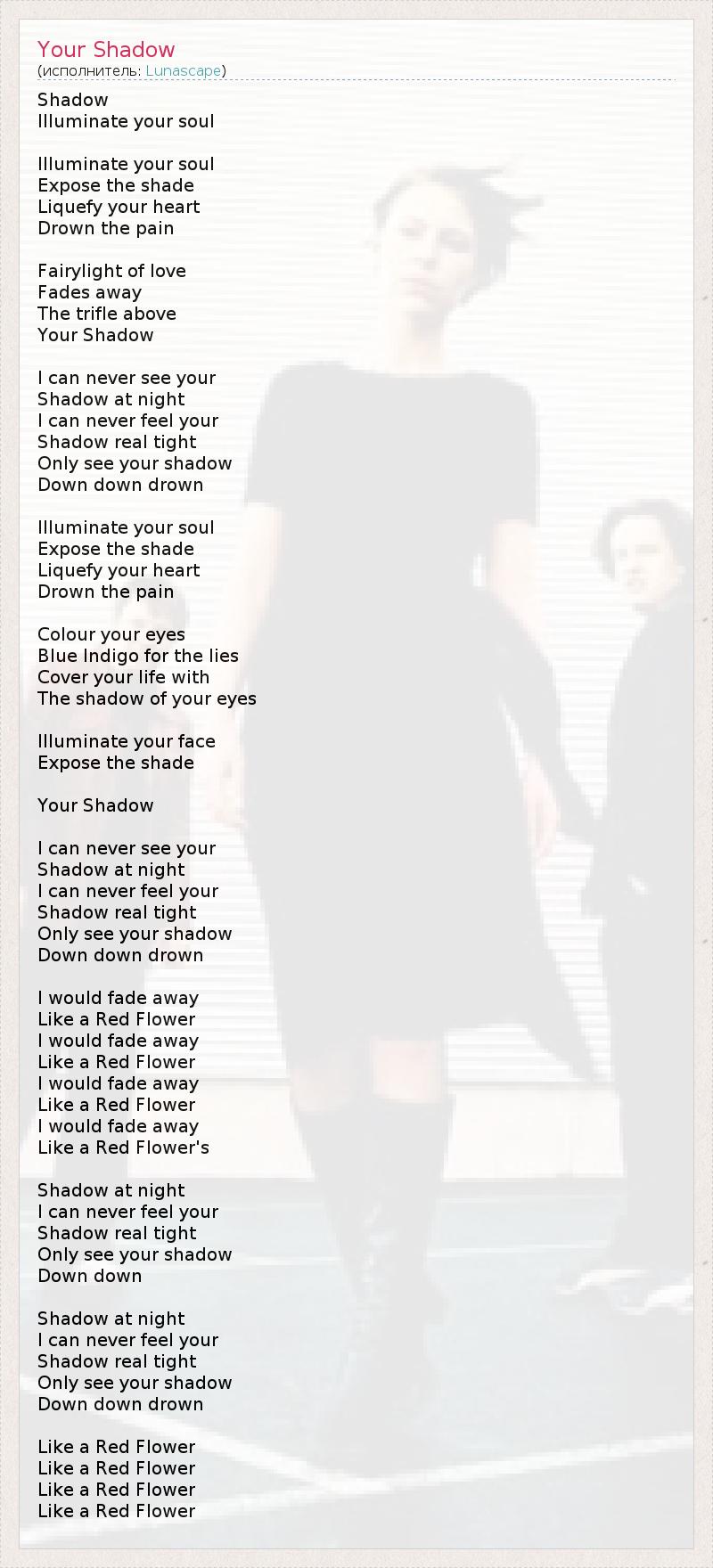 Shadow Illuminate your soul Illuminate your soul Expose the shade Liquefy your heart Drown the pain Fairylight of love Fades away The trifle above Your Shadow I can never see your Shadow at night I can never feel your Shadow real tight Only see your shadow Down down drown Illuminate your soul Expose the shade Liquefy your heart Drown the pain Colour your eyes Blue Indigo for the lies Cover your life with The shadow of your eyes Illuminate your face Expose the shade Your Shadow I can never see your Shadow at night I can never feel your Shadow real tight Only see your shadow Down down drown I would fade away Like a Red Flower I would fade away Like a Red Flower I would fade away Like a Red Flower I would fade away Like a Red Flower's Shadow at night I can never feel your Shadow real tight Only see your shadow Down down Shadow at night I can never feel your Shadow real tight Only see your shadow Down down drown Like a Red Flower Like a Red Flower Like a Red Flower Like a Red Flower