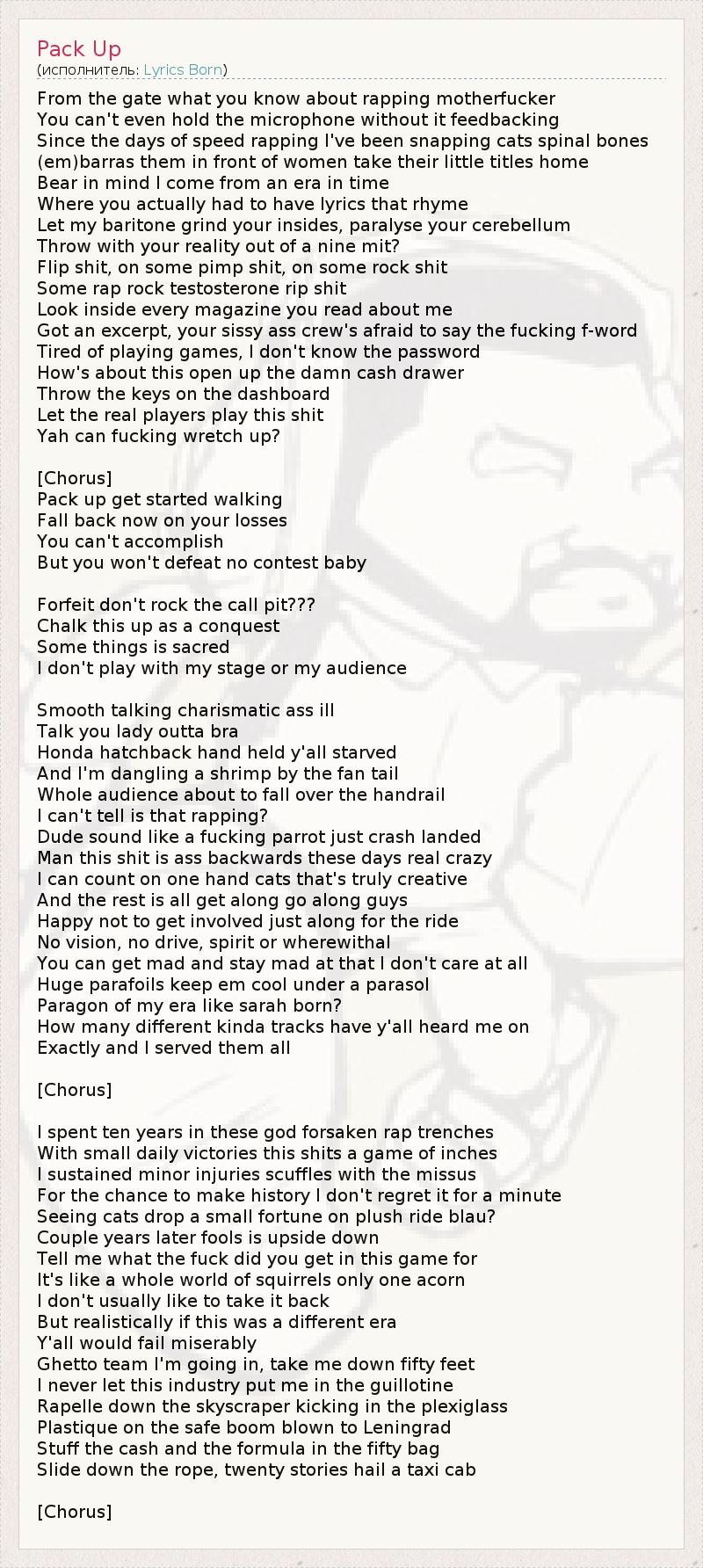 From the gate what you know about rapping motherfucker You can't even hold the microphone without it feedbacking Since the days of speed rapping I've been snapping cats spinal bones (em)barras them in front of women take their little titles home Bear in mind I come from an era in time Where you actually had to have lyrics that rhyme Let my baritone grind your insides, paralyse your cerebellum Throw with your reality out of a nine mit? Flip shit, on some pimp shit, on some rock shit Some rap rock testosterone rip shit Look inside every magazine you read about me Got an excerpt, your sissy ass crew's afraid to say the fucking f-word Tired of playing games, I don't know the password How's about this open up the damn cash drawer Throw the keys on the dashboard Let the real players play this shit Yah can fucking wretch up? [Chorus] Pack up get started walking Fall back now on your losses You can't accomplish But you won't defeat no contest baby Forfeit don't rock the call pit??? Chalk this up as a conquest Some things is sacred I don't play with my stage or my audience Smooth talking charismatic ass ill Talk you lady outta bra Honda hatchback hand held y'all starved And I'm dangling a shrimp by the fan tail Whole audience about to fall over the handrail I can't tell is that rapping? Dude sound like a fucking parrot just crash landed Man this shit is ass backwards these days real crazy I can count on one hand cats that's truly creative And the rest is all get along go along guys Happy not to get involved just along for the ride No vision, no drive, spirit or wherewithal You can get mad and stay mad at that I don't care at all Huge parafoils keep em cool under a parasol Paragon of my era like sarah born? How many different kinda tracks have y'all heard me on Exactly and I served them all [Chorus] I spent ten years in these god forsaken rap trenches With small daily victories this shits a game of inches I sustained minor injuries scuffles with the missus For the chance to make history I don't regret it for a minute Seeing cats drop a small fortune on plush ride blau? Couple years later fools is upside down Tell me what the fuck did you get in this game for It's like a whole world of squirrels only one acorn I don't usually like to take it back But realistically if this was a different era Y'all would fail miserably Ghetto team I'm going in, take me down fifty feet I never let this industry put me in the guillotine Rapelle down the skyscraper kicking in the plexiglass Plastique on the safe boom blown to Leningrad Stuff the cash and the formula in the fifty bag Slide down the rope, twenty stories hail a taxi cab [Chorus]