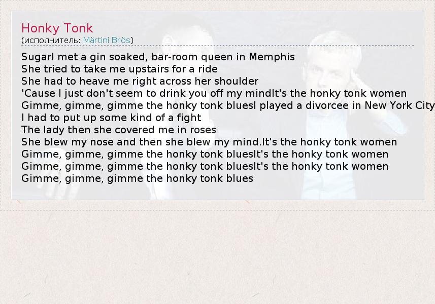 А как ты думаешь, о чем песня "Honky Tonk" ?