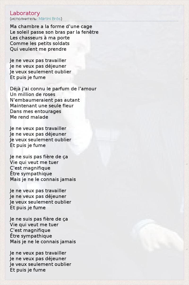 У моей комнаты форма клетки, Солнце пробивается сквозь окно, Охотники у моей двери, Как игрушечные солдатики, Которые хотят меня захватить. Я не хочу работать, Я не хочу завтракать, Я хочу лишь забыть, А потом я курю. Мне уже известен запах любви, Миллион роз Не благоухают так, Как сейчас единственный цветок Рядом со мной, Что делает меня больной. Я не хочу работать, Я не хочу завтракать, Я хочу лишь забыть, А потом я курю. Я не горжусь этим, Жизнью, которая желает убить меня, Это потрясающе, Быть милой, Но у меня никогда это не получается. Я не хочу работать, Я не хочу завтракать, Я хочу лишь забыть, А потом я курю. Я не горжусь этим, Жизнью, которая желает убить меня, Это потрясающе, Быть милой, Но у меня никогда это не получается. Я не хочу работать, Я не хочу завтракать, Я хочу лишь забыть, А потом я курю. * первоисточником песни послужило стихотворение "Hôtel" Гийома Аполлинера.