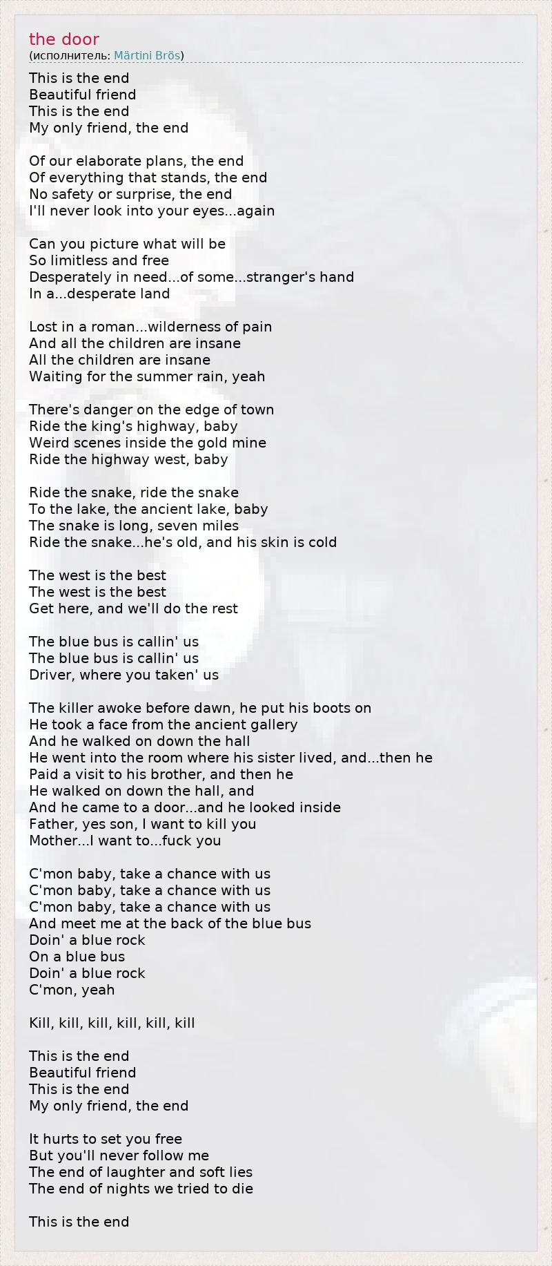Это конец, Мой прекрасный друг. Это конец, Мой единственный друг…конец Нашим тщательно продуманным планам - конец... Всему, что имеет значение, - конец... Ни спасения, ни удивления, - конец.... Я никогда больше не взгляну в твои глаза…. Ты можешь представить, что будет Таким безграничным и свободным, Отчаянно нуждаясь в руке какого-нибудь незнакомца В стране отчаяния?.. Заблудшие в католических зарослях боли, Все дети обезумели, Все дети обезумели В ожидании летнего дождя, да.... Опасность на краю города, Езжай по Королевскому шоссе, детка. Странные сцены на золотом прииске, Езжай по шоссе на запад, детка.... Езжай на змее, езжай на змее К озеру, к древнему озеру, детка. Змея длиной в семь миль, Езжай на змее, она старая, и её кожа остыла... На западе лучше всего, На западе лучше всего, Поедем туда и там сделаем всё остальное... Голубой автобус зовет нас, Голубой автобус зовет нас, Водитель, где ты нас подобрал? Убийца проснулся засветло, надел свои сапоги, Выбрал себе обличье из галереи предков И пошел по коридору. Зашел в комнату, где жила его сестра… затем Зашел к своему брату, затем Пошел по коридору дальше, и… И подошел к двери….заглянул внутрь Папа? – Да, сынок. – Я хочу убить тебя. Мама?.....я хочу….тра*нуть тебя Иди сюда детка, попытай с нами счастья, Иди сюда детка, попытай с нами счастья, Иди сюда детка, попытай с нами счастья, Встретимся на заднем сидении голубого автобуса, Играя голубой рок В голубом автобусе, Играя голубой рок... Присоединяйся, да! Убивать, убивать, убивать, убивать, убивать, убивать Это конец, Мой прекрасный друг... Это конец, Мой единственный друг… конец Мне больно отпускать тебя, Но ты никогда не последуешь за мной. Конец смеху и слезам, Конец ночам, в которые мы пытались умереть... Это конец