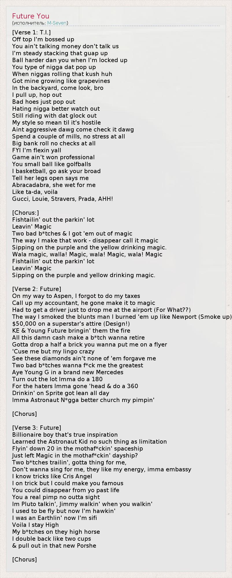 [Куплет 1: T.I.] Без сомнений я тут командую! Вы не говорите о деньгах – не говорите о нас! Я постоянно увеличиваю доход, Получаю больше вас, когда заперт, 1 Ты из тех ниг*еров, что внезапно откуда-то появляются, Когда другие скручивают косяк, ха! Я выращиваю свои, как виноград, На заднем дворе - иди, посмотри, братан! Я тяну за курок, проваливайте! Шл*хи, просто валите отседова! Хейтеры, лучше остерегайтесь, До сих пор езжу с пистолетом наготове. Мой стиль такой неприглядный до тех пор, пока он не воинственен! Не агрессивный, братан, зацени же, братан! Трачу пару миллионов, вовсе без напряга, Большая стопка наличных - никаких чеков. К вашему сведению я шикую, В игре не победить профессионала! Вы не так успешны, как и мячи в гольфе, 2 Я же успешен, как баскетбол, иди, спроси свою девку, Скажи ей, что её раздвинутые ноги говорят мне: "Абракадабра", он завелась от меня, Как та-да, вуаля, Gucci, Louie, Stravers, Prada, ахх! 3 [Припев:] Скитаемся у парковки, Покидаем Magic! 4 Две "плохие суч*и", я заполучил их с помощью волшебства! То, каким образом я заставил нас исчезнуть – называйте это магией! Хлипаю напиток 5 – это питьевая магия! Не правда, ли – магия, не правда, ли – магия! Скитаемся у парковки, Покидаем Magic! Хлипаю напиток – это питьевая магия! [Куплет 2: Future] На пути в Аспен я забыл заплатить налоги, Позвоню своему бухгалтеру, он устроит фокус! Нужен водитель, чтобы выбросил меня у аэропорта (Для чего?) Я курю косяки, поджигая их, как Newport 6 (Затянись) 50 000 баксов на прикид суперзвезды! Молодой Future с корешом жарят! Все эти гр*баные деньги побуждают суч*у уволиться! Должен отстегнуть полкирпича 7 чтобы моё имя напечатали на флаере! Простите, но у меня сумасшедший жаргон! Видите эти бриллианты? Ни один из них не сможет искупить моей вины! Две "плохие суч*и хотят тр*хнуться со мной, с величайшим! Эй, Young G на новёхоньком Мерсе! Выезжаю с парковки после разворота на 180, Но для хейтеров я пойду дальше и сделаю 360! Пью Спрайт с сиропом весь день! 8 Я астронавт, ниг*а, лучше зацени мою тачилу! [Припев:] [Куплет 3: Future] Парень-миллиардер – вот правильное вдохновение! Ребенок-астронавт не усвоил такого понятия как ограничение. Приземляюсь под 20 миль в час на чертовом космическом корабле. Только что покинул клуб "Magic" в день скидок. Две "плохи суч*и" плетутся следом - у них есть кое-что для меня. Я пою не для себя, им нравится моя энергия, я посланец! Я знаю трюки как Cris Angel, 9 Я развожу, но также мог бы сделать тебя известным! Ты мог бы испариться из своей прежней жизни! Ты реальный сутенер, вне поле зрения! Говорю, как Плутон, а у тебя походка Jimmy. Раньше я был стильным, а теперь охочусь, Я был землянином, теперь я - "научная фантастика"! Вуаля, остаюсь на высоте, Мои суч*и зазнаются! Я подаю назад на двух колёсах И отъезжаю в этом новом Порше! [Припев:] 1 – T.I. сидел в тюрьме, когда вышел его альбом "No Mercy", который все равно достиг золотого статуса. 2 – Играет на словах, I Ball - на сленге значит деньги гребет и т.д. А мячи в гольфе по размеру намного меньше чем в баскетболле. 3 – Модные бренды. 4 – Magic City Atlanta - Стрип клуб в Атланте. 5 – Purple drank - это сленговый термин наркотика популярного в хип хоп обществе в южных Штатах. Его часто смешивают с соком. Также Purple и Yellow (Gold) - цвета баскетбольного клуба "Lakers". 6 – Newport - бренд ментоловых сигарет. 7 – Brick (буквально: кирпич) - большое количество наркотического вещества (кокаина, марихуаны), плотно упакован