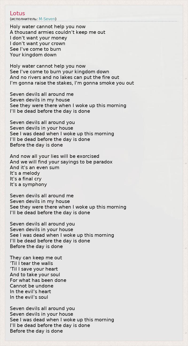 Святая вода не поможет тебе теперь, Тысяча армий не смогли бы меня остановить, Мне не нужны твои деньги Мне не нужна твоя корона, Знаешь, я пришла, чтобы сжечь Твоё королевство дотла Святая вода не поможет тебе теперь, Знаешь, я пришла, чтобы сжечь твоё королевство дотла. И ни реки, ни озера не потушат пожар, Я поднимаю ставки, я разоблачу тебя Семь грехов окружают меня, Семь грехов в моём доме, Знаешь, они были там, когда я проснулась этим утром, Я умру прежде, чем кончится этот день Семь грехов окружают меня, Семь грехов в моём доме. Знаешь, я была мертва, когда проснулась утром, Я умру прежде, чем кончится этот день, Прежде, чем кончится этот день И теперь вся твоя ложь будет изгнана, И мы посчитаем твои слова парадоксом, И это красивый итог, 2 Это мелодия, Это последний крик, Это симфония Семь грехов окружают меня, Семь грехов в моём доме, Знаешь, они были там, когда я проснулась этим утром, Я умру прежде, чем кончится этот день Семь грехов окружают меня, Семь грехов в твоем доме. Знаешь, я была мертва, когда проснулась утром, Я умру прежде, чем кончится этот день, Прежде, чем кончится этот день Они могут сдерживать меня, Пока я не разрушу стены, Пока я не спасу твое сердце И не заберу твою душу, Ведь что сделано - То сделано, В сердце зла, В душе зла Семь грехов окружают меня, Семь грехов в твоем доме. Знаешь, я была мертва, когда проснулась утром, Я умру прежде, чем кончится этот день, Прежде, чем кончится этот день 1 - дословно: семь дьяволов 2 - дословно: четная сумма