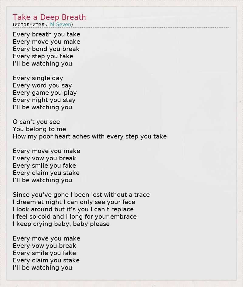 Every breath you take Every move you make Every bond you break Every step you take I'll be watching you Every single day Every word you say Every game you play Every night you stay I'll be watching you O can't you see You belong to me How my poor heart aches with every step you take Every move you make Every vow you break Every smile you fake Every claim you stake I'll be watching you Since you've gone I been lost without a trace I dream at night I can only see your face I look around but it's you I can't replace I feel so cold and I long for your embrace I keep crying baby, baby please Every move you make Every vow you break Every smile you fake Every claim you stake I'll be watching you
