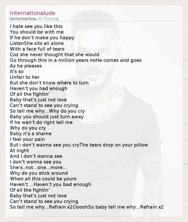 I hate see you like this You should be with me If he don't make you happy ListenShe sits all alone With a face full of tears Coz she never thought that she would Go through this in a million years noHe comes and goes As he pleases It's so Unfair to her But she don't know where to turn Haven't you had enough Of all the fightin' Baby that's just not love Can't stand to see you crying So tell me why...Why do you cry Baby you should just turn away If he wan't do right tell me Why do you cry Baby it's a shame I feel your pain But i don't wanna see you cryThe tears drop on your pillow At night And I don't wanna see I don't wanna see you She's..not...one...more... Why do you stick around When all this could be yours Haven't ...Haven't you bad enough Of all the fightin' Baby that's just not love Can't stand to see you crying So tell me why...Refrain x2OooohSo baby tell me why...Refrain x2