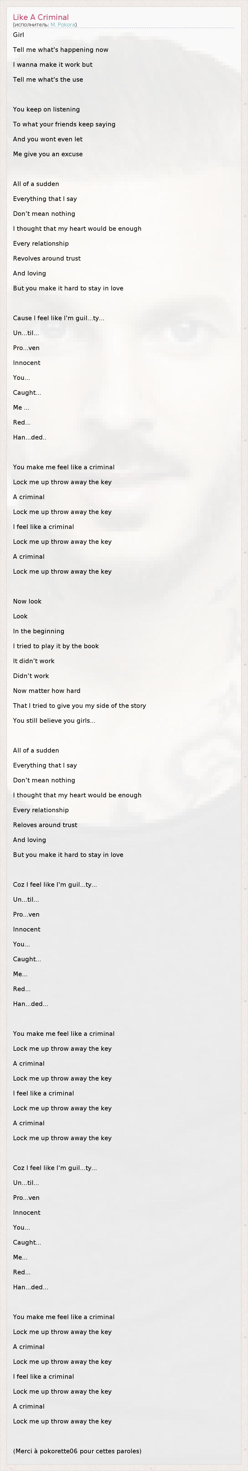 Girl Tell me what's happening now I wanna make it work but Tell me what's the use You keep on listening To what your friends keep saying And you wont even let Me give you an excuse All of a sudden Everything that I say Don't mean nothing I thought that my heart would be enough Every relationship Revolves around trust And loving But you make it hard to stay in love Cause I feel like I'm guil...ty... Un...til... Pro...ven Innocent You... Caught... Me ... Red... Han...ded.. You make me feel like a criminal Lock me up throw away the key A criminal Lock me up throw away the key I feel like a criminal Lock me up throw away the key A criminal Lock me up throw away the key Now look Look In the beginning I tried to play it by the book It didn't work Didn't work Now matter how hard That I tried to give you my side of the story You still believe you girls... All of a sudden Everything that I say Don't mean nothing I thought that my heart would be enough Every relationship Reloves around trust And loving But you make it hard to stay in love Coz I feel like I'm guil...ty... Un...til... Pro...ven Innocent You... Caught... Me... Red... Han...ded... You make me feel like a criminal Lock me up throw away the key A criminal Lock me up throw away the key I feel like a criminal Lock me up throw away the key A criminal Lock me up throw away the key Coz I feel like I'm guil...ty... Un...til... Pro...ven Innocent You... Caught... Me... Red... Han...ded... You make me feel like a criminal Lock me up throw away the key A criminal Lock me up throw away the key I feel like a criminal Lock me up throw away the key A criminal Lock me up throw away the key (Merci à pokorette06 pour cettes paroles)