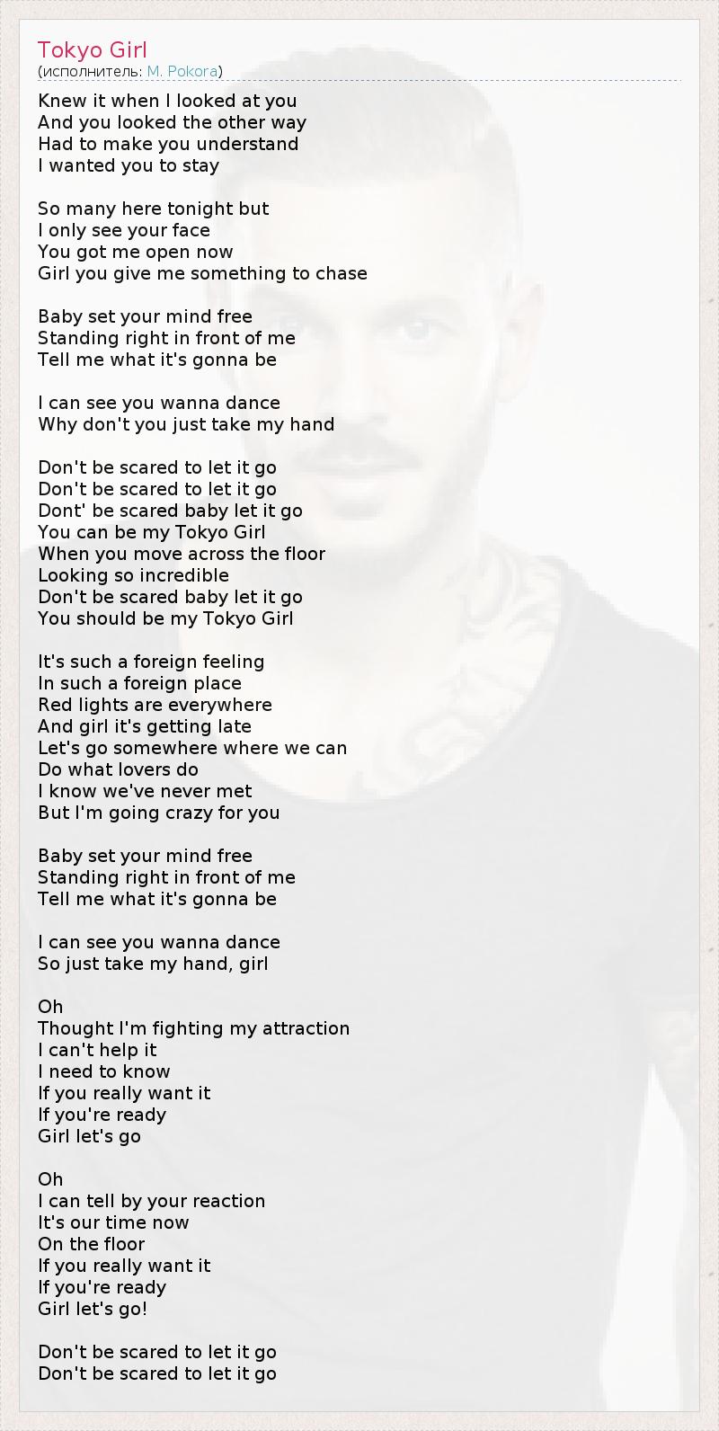 Я знал – когда я смотрел на тебя, Ты смотрела совсем по-другому. Нужно было убедить тебя – Я хотел, чтобы ты осталась… Сегодня здесь так много лиц, Но я вижу лишь тебя. Ты раскрыла меня, Девчонка, теперь я вижу, за чем мне нужно гнаться. Детка, выпусти на свободу свои мысли. Стоя прямо передо мною, Скажи мне, что будет дальше? Я вижу, что ты хочешь танцевать, Почему бы тебе просто не взять меня за руку? Чего ты боишься? Пусть всё будет так. Не бойся, пусть всё будет так, Не бойся, детка, пусть всё будет так, как есть. Ты можешь быть моей девушкой из Токио, Когда ты танцуешь И выглядишь так потрясающе. Не бойся, детка, пусть всё будет так, как есть, Ты должна стать моей девушкой из Токио. Такое чужое чувство, Такое чужое место, Повсюду красные огни, И девушка опаздывает. Пойдём куда-нибудь, где мы можем заняться Тем, что делают все влюблённые. Я знаю, мы никогда не встречались, Но я схожу с ума от тебя… Детка, выпусти на свободу свои мысли. Стоя прямо передо мною, Скажи мне, что будет дальше? Я вижу, что ты хочешь танцевать, Ну же, просто возьми меня за руку, девчонка. О, Я думал, что смогу бороться со своим влечением, Но я бессилен. Мне нужно знать, Действительно ли ты хочешь этого. Если ты готова, Девочка, вперёд! О, Я вижу по твоей реакции: Наше время пришло Здесь, на танцплощадке. Если ты правда хочешь этого, Если ты готова, Девочка, вперёд! Не бойся, пусть всё будет так, Не бойся, детка, пусть всё будет так, как есть.