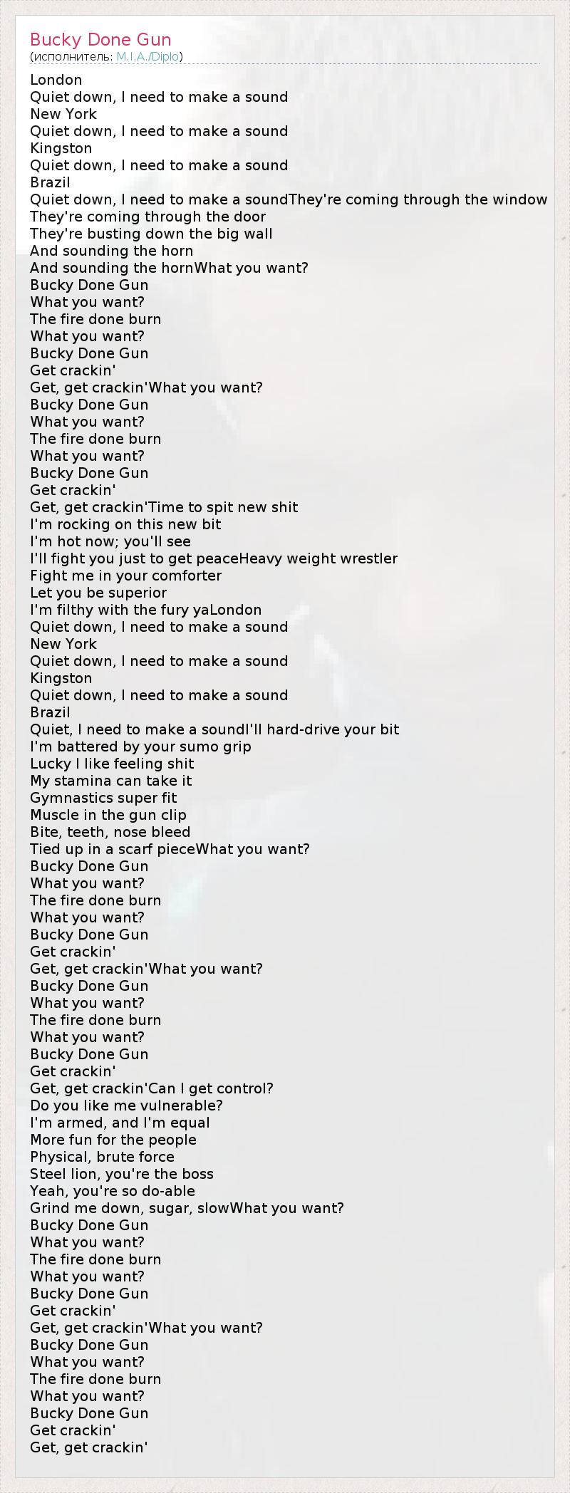 London Quiet down, I need to make a sound New York Quiet down, I need to make a sound Kingston Quiet down, I need to make a sound Brazil Quiet down, I need to make a soundThey're coming through the window They're coming through the door They're busting down the big wall And sounding the horn And sounding the hornWhat you want? Bucky Done Gun What you want? The fire done burn What you want? Bucky Done Gun Get crackin' Get, get crackin'What you want? Bucky Done Gun What you want? The fire done burn What you want? Bucky Done Gun Get crackin' Get, get crackin'Time to spit new shit I'm rocking on this new bit I'm hot now; you'll see I'll fight you just to get peaceHeavy weight wrestler Fight me in your comforter Let you be superior I'm filthy with the fury yaLondon Quiet down, I need to make a sound New York Quiet down, I need to make a sound Kingston Quiet down, I need to make a sound Brazil Quiet, I need to make a soundI'll hard-drive your bit I'm battered by your sumo grip Lucky I like feeling shit My stamina can take it Gymnastics super fit Muscle in the gun clip Bite, teeth, nose bleed Tied up in a scarf pieceWhat you want? Bucky Done Gun What you want? The fire done burn What you want? Bucky Done Gun Get crackin' Get, get crackin'What you want? Bucky Done Gun What you want? The fire done burn What you want? Bucky Done Gun Get crackin' Get, get crackin'Can I get control? Do you like me vulnerable? I'm armed, and I'm equal More fun for the people Physical, brute force Steel lion, you're the boss Yeah, you're so do-able Grind me down, sugar, slowWhat you want? Bucky Done Gun What you want? The fire done burn What you want? Bucky Done Gun Get crackin' Get, get crackin'What you want? Bucky Done Gun What you want? The fire done burn What you want? Bucky Done Gun Get crackin' Get, get crackin'