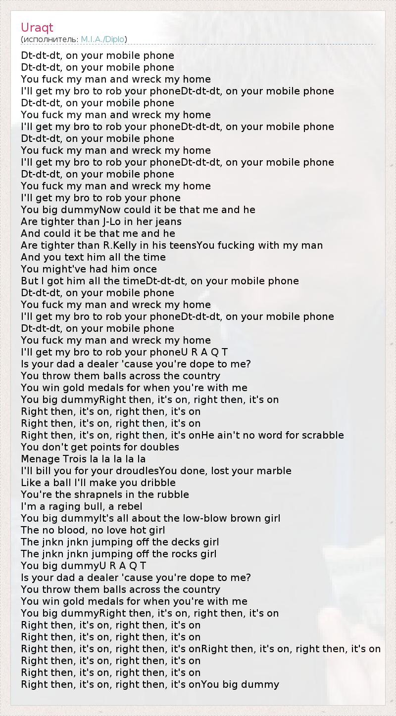 Dt-dt-dt, on your mobile phone Dt-dt-dt, on your mobile phone You fuck my man and wreck my home I'll get my bro to rob your phoneDt-dt-dt, on your mobile phone Dt-dt-dt, on your mobile phone You fuck my man and wreck my home I'll get my bro to rob your phoneDt-dt-dt, on your mobile phone Dt-dt-dt, on your mobile phone You fuck my man and wreck my home I'll get my bro to rob your phoneDt-dt-dt, on your mobile phone Dt-dt-dt, on your mobile phone You fuck my man and wreck my home I'll get my bro to rob your phone You big dummyNow could it be that me and he Are tighter than J-Lo in her jeans And could it be that me and he Are tighter than R.Kelly in his teensYou fucking with my man And you text him all the time You might've had him once But I got him all the timeDt-dt-dt, on your mobile phone Dt-dt-dt, on your mobile phone You fuck my man and wreck my home I'll get my bro to rob your phoneDt-dt-dt, on your mobile phone Dt-dt-dt, on your mobile phone You fuck my man and wreck my home I'll get my bro to rob your phoneU R A Q T Is your dad a dealer 'cause you're dope to me? You throw them balls across the country You win gold medals for when you're with me You big dummyRight then, it's on, right then, it's on Right then, it's on, right then, it's on Right then, it's on, right then, it's on Right then, it's on, right then, it's onHe ain't no word for scrabble You don't get points for doubles Menage Trois la la la la la I'll bill you for your droudlesYou done, lost your marble Like a ball I'll make you dribble You're the shrapnels in the rubble I'm a raging bull, a rebel You big dummyIt's all about the low-blow brown girl The no blood, no love hot girl The jnkn jnkn jumping off the decks girl The jnkn jnkn jumping off the rocks girl You big dummyU R A Q T Is your dad a dealer 'cause you're dope to me? You throw them balls across the country You win gold medals for when you're with me You big dummyRight then, it's on, right then, it's on Right then, it's on, right then, it's on Right then, it's on, right then, it's on Right then, it's on, right then, it's onRight then, it's on, right then, it's on Right then, it's on, right then, it's on Right then, it's on, right then, it's on Right then, it's on, right then, it's onYou big dummy