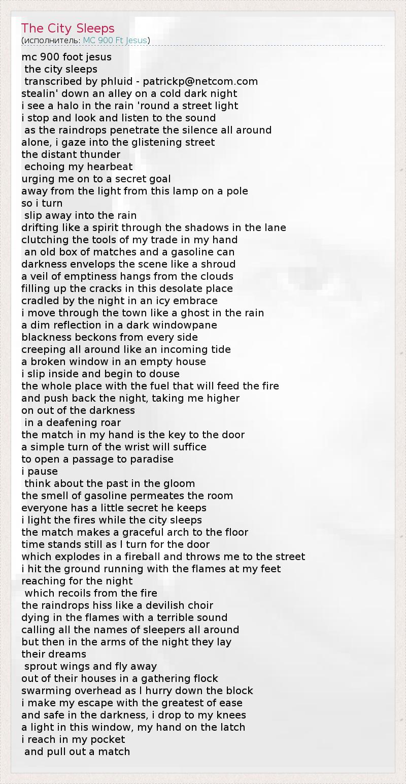 mc 900 foot jesus the city sleeps transcribed by phluid - patrickp@netcom.com stealin' down an alley on a cold dark night i see a halo in the rain 'round a street light i stop and look and listen to the sound as the raindrops penetrate the silence all around alone, i gaze into the glistening street the distant thunder echoing my hearbeat urging me on to a secret goal away from the light from this lamp on a pole so i turn slip away into the rain drifting like a spirit through the shadows in the lane clutching the tools of my trade in my hand an old box of matches and a gasoline can darkness envelops the scene like a shroud a veil of emptiness hangs from the clouds filling up the cracks in this desolate place cradled by the night in an icy embrace i move through the town like a ghost in the rain a dim reflection in a dark windowpane blackness beckons from every side creeping all around like an incoming tide a broken window in an empty house i slip inside and begin to douse the whole place with the fuel that will feed the fire and push back the night, taking me higher on out of the darkness in a deafening roar the match in my hand is the key to the door a simple turn of the wrist will suffice to open a passage to paradise i pause think about the past in the gloom the smell of gasoline permeates the room everyone has a little secret he keeps i light the fires while the city sleeps the match makes a graceful arch to the floor time stands still as I turn for the door which explodes in a fireball and throws me to the street i hit the ground running with the flames at my feet reaching for the night which recoils from the fire the raindrops hiss like a devilish choir dying in the flames with a terrible sound calling all the names of sleepers all around but then in the arms of the night they lay their dreams sprout wings and fly away out of their houses in a gathering flock swarming overhead as I hurry down the block i make my escape with the greatest of ease and safe in the darkness, i drop to my knees a light in this window, my hand on the latch i reach in my pocket and pull out a match