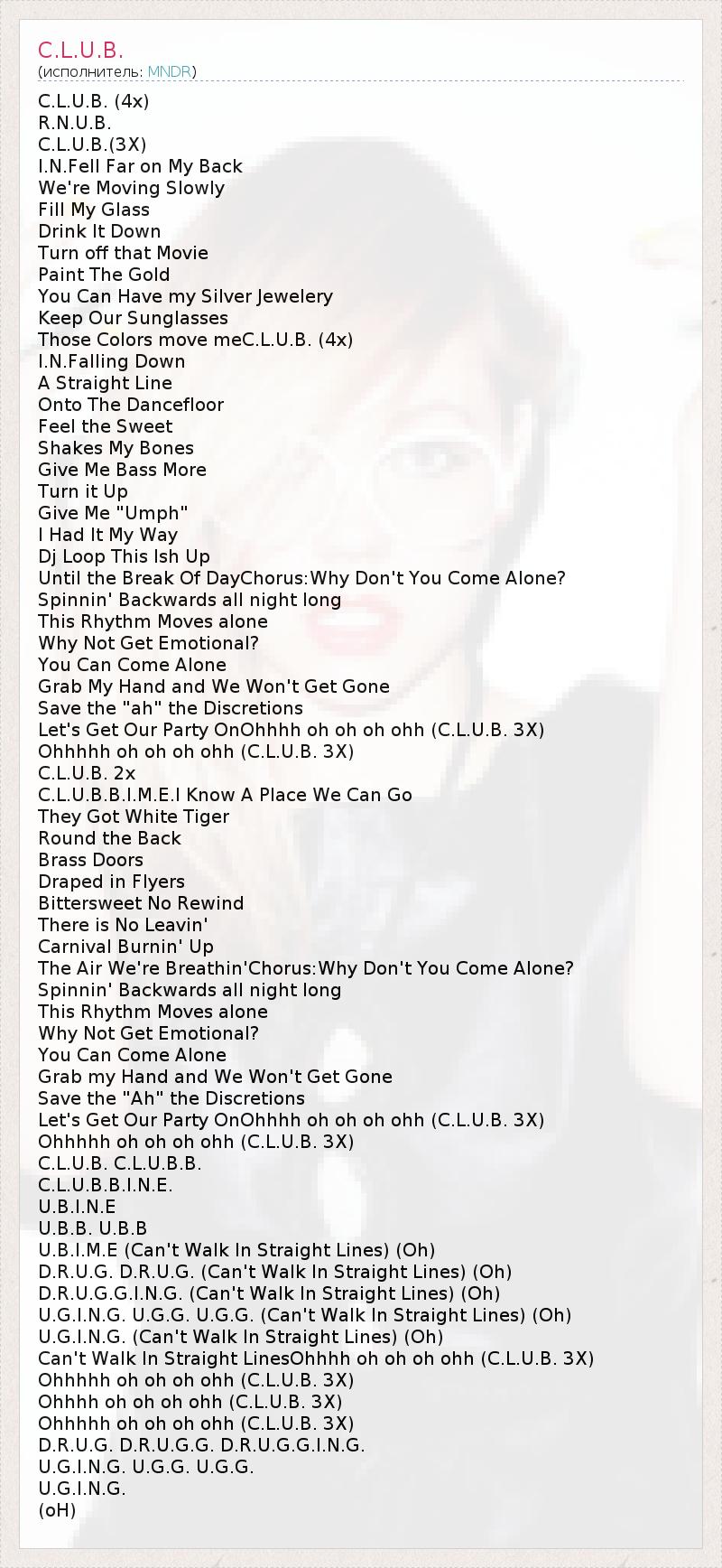 C.L.U.B. (4x) R.N.U.B. C.L.U.B.(3X) I.N.Fell Far on My Back We're Moving Slowly Fill My Glass Drink It Down Turn off that Movie Paint The Gold You Can Have my Silver Jewelery Keep Our Sunglasses Those Colors move meC.L.U.B. (4x) I.N.Falling Down A Straight Line Onto The Dancefloor Feel the Sweet Shakes My Bones Give Me Bass More Turn it Up Give Me "Umph" I Had It My Way Dj Loop This Ish Up Until the Break Of DayChorus:Why Don't You Come Alone? Spinnin' Backwards all night long This Rhythm Moves alone Why Not Get Emotional? You Can Come Alone Grab My Hand and We Won't Get Gone Save the "ah" the Discretions Let's Get Our Party OnOhhhh oh oh oh ohh (C.L.U.B. 3X) Ohhhhh oh oh oh ohh (C.L.U.B. 3X) C.L.U.B. 2x C.L.U.B.B.I.M.E.I Know A Place We Can Go They Got White Tiger Round the Back Brass Doors Draped in Flyers Bittersweet No Rewind There is No Leavin' Carnival Burnin' Up The Air We're Breathin'Chorus:Why Don't You Come Alone? Spinnin' Backwards all night long This Rhythm Moves alone Why Not Get Emotional? You Can Come Alone Grab my Hand and We Won't Get Gone Save the "Ah" the Discretions Let's Get Our Party OnOhhhh oh oh oh ohh (C.L.U.B. 3X) Ohhhhh oh oh oh ohh (C.L.U.B. 3X) C.L.U.B. C.L.U.B.B. C.L.U.B.B.I.N.E. U.B.I.N.E U.B.B. U.B.B U.B.I.M.E (Can't Walk In Straight Lines) (Oh) D.R.U.G. D.R.U.G. (Can't Walk In Straight Lines) (Oh) D.R.U.G.G.I.N.G. (Can't Walk In Straight Lines) (Oh) U.G.I.N.G. U.G.G. U.G.G. (Can't Walk In Straight Lines) (Oh) U.G.I.N.G. (Can't Walk In Straight Lines) (Oh) Can't Walk In Straight LinesOhhhh oh oh oh ohh (C.L.U.B. 3X) Ohhhhh oh oh oh ohh (C.L.U.B. 3X) Ohhhh oh oh oh ohh (C.L.U.B. 3X) Ohhhhh oh oh oh ohh (C.L.U.B. 3X) D.R.U.G. D.R.U.G.G. D.R.U.G.G.I.N.G. U.G.I.N.G. U.G.G. U.G.G. U.G.I.N.G. (oH)