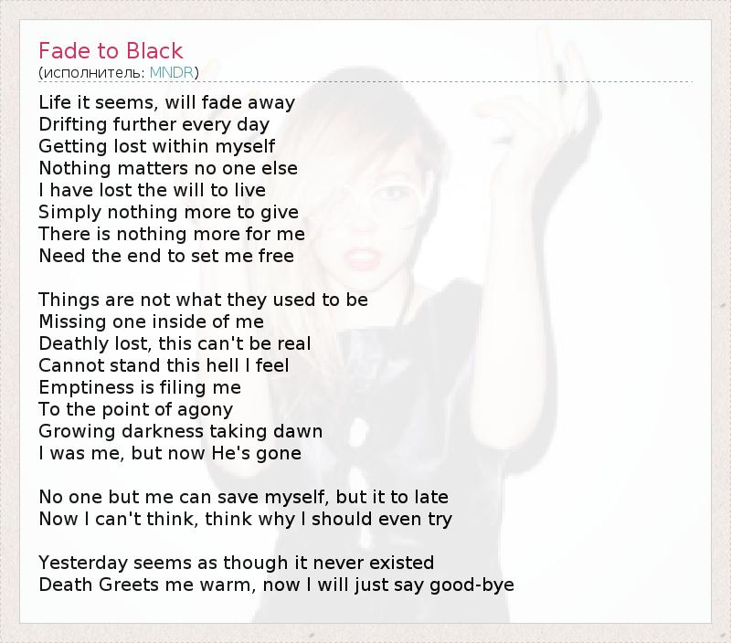 Life it seems, will fade away Drifting further every day Getting lost within myself Nothing matters no one else I have lost the will to live Simply nothing more to give There is nothing more for me Need the end to set me free Things are not what they used to be Missing one inside of me Deathly lost, this can't be real Cannot stand this hell I feel Emptiness is filing me To the point of agony Growing darkness taking dawn I was me, but now He's gone No one but me can save myself, but it to late Now I can't think, think why I should even try Yesterday seems as though it never existed Death Greets me warm, now I will just say good-bye