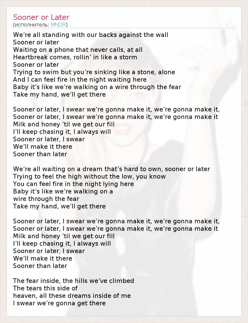 We’re all standing with our backs against the wall Sooner or later Waiting on a phone that never calls, at all Heartbreak comes, rollin’ in like a storm Sooner or later Trying to swim but you’re sinking like a stone, alone And I can feel fire in the night waiting here Baby it’s like we’re walking on a wire through the fear Take my hand, we’ll get there Sooner or later, I swear we’re gonna make it, we’re gonna make it, Sooner or later, I swear we’re gonna make it, we’re gonna make it Milk and honey ’til we get our fill I’ll keep chasing it, I always will Sooner or later, I swear We’ll make it there Sooner than later We’re all waiting on a dream that’s hard to own, sooner or later Trying to feel the high without the low, you know You can feel fire in the night lying here Baby it’s like we’re walking on a wire through the fear Take my hand, we’ll get there Sooner or later, I swear we’re gonna make it, we’re gonna make it, Sooner or later, I swear we’re gonna make it, we’re gonna make it Milk and honey ’til we get our fill I’ll keep chasing it, I always will Sooner or later, I swear We’ll make it there Sooner than later The fear inside, the hills we’ve climbed The tears this side of heaven, all these dreams inside of me I swear we’re gonna get there