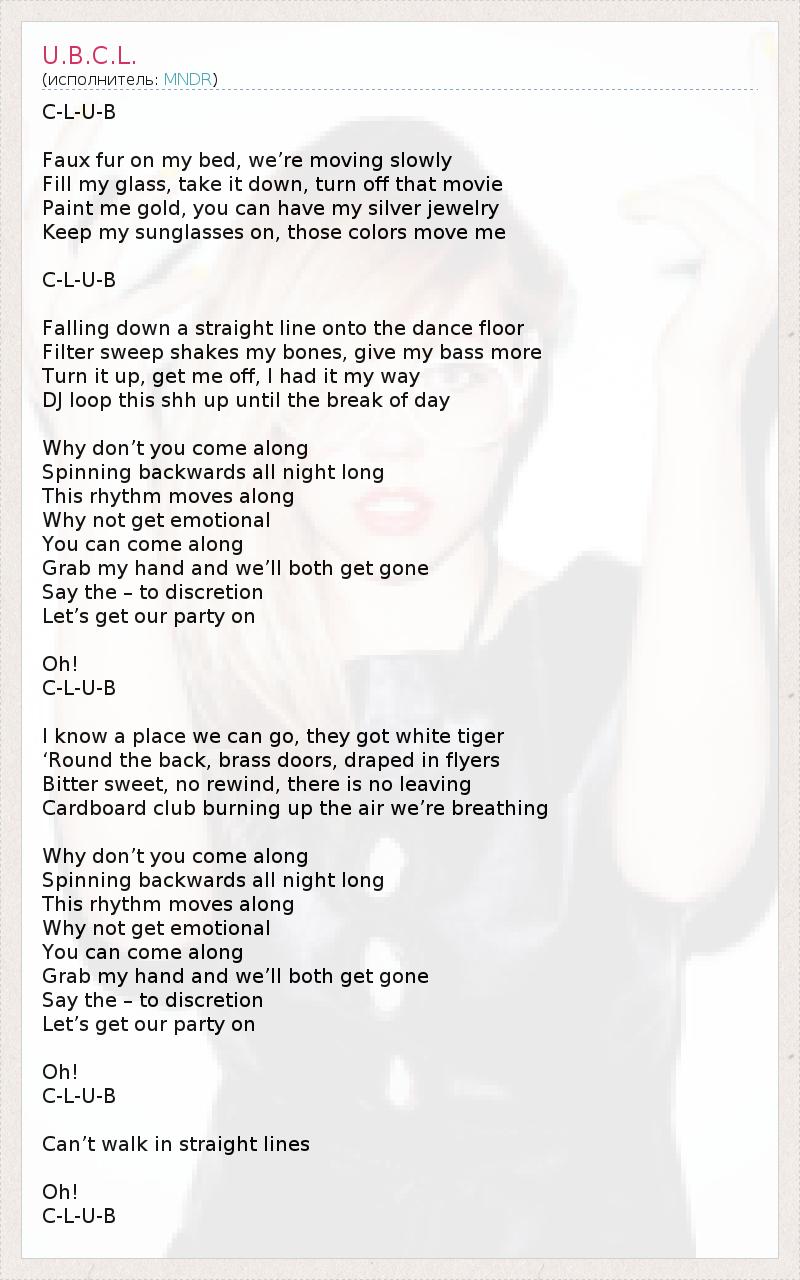 C-L-U-B Faux fur on my bed, we’re moving slowly Fill my glass, take it down, turn off that movie Paint me gold, you can have my silver jewelry Keep my sunglasses on, those colors move me C-L-U-B Falling down a straight line onto the dance floor Filter sweep shakes my bones, give my bass more Turn it up, get me off, I had it my way DJ loop this shh up until the break of day Why don’t you come along Spinning backwards all night long This rhythm moves along Why not get emotional You can come along Grab my hand and we’ll both get gone Say the – to discretion Let’s get our party on Oh! C-L-U-B I know a place we can go, they got white tiger ‘Round the back, brass doors, draped in flyers Bitter sweet, no rewind, there is no leaving Cardboard club burning up the air we’re breathing Why don’t you come along Spinning backwards all night long This rhythm moves along Why not get emotional You can come along Grab my hand and we’ll both get gone Say the – to discretion Let’s get our party on Oh! C-L-U-B Can’t walk in straight lines Oh! C-L-U-B