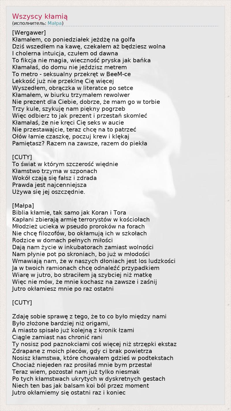 [Wergawer] Kłamałem, co poniedziałek jeżdżę na golfa Dziś wszedłem na kawę, czekałem aż będziesz wolna I cholerna intuicja, czułem od dawna To fikcja nie magia, wieczność pryska jak bańka Kłamałaś, do domu nie jeździsz metrem To metro - seksualny przekręt w BeeM-ce Lekkość już nie przeklnę Cię więcej Wyszedłem, obrączka w literatce po setce Kłamałem, w biurku trzymałem rewolwer Nie prezent dla Ciebie, dobrze, że mam go w torbie Trzy kule, szykuję nam piękny pogrzeb Więc odbierz to jak prezent i przestań skomleć Kłamałaś, że nie kręci Cię seks w aucie Nie przestawajcie, teraz chcę na to patrzeć Ołów łamie czaszkę, poczuj krew i klękaj Pamiętasz? Razem na zawsze, razem do piekła [CUTY] To świat w którym szczerość więdnie Kłamstwo trzyma w szponach Wokół czają się fałsz i zdrada Prawda jest najcenniejsza Używa się jej oszczędnie. [Małpa] Biblia kłamie, tak samo jak Koran i Tora Kapłani zbierają armię terrorystów w kościołach Młodzież ucieka w pseudo proroków na forach Nie chcę filozofów, bo okłamują ich w szkołach Rodzice w domach pełnych miłości Dają nam życie w inkubatorach zamiast wolności Nam płynie pot po skroniach, bo już w młodości Wmawiają nam, że w naszych dłoniach jest los ludzkości Ja w twoich ramionach chcę odnaleźć przypadkiem Wiarę w jutro, bo straciłem ją szybciej niż matkę Więc nie mów, że mnie kochasz na zawsze i zaśnij Jutro okłamiesz mnie po raz ostatni [CUTY] Zdaję sobie sprawę z tego, że to co było między nami Było złożone bardziej niż origami, A miasto spisało już kolejną z kronik łzami Ciągle zamiast nas chronić rani Ty nosisz pod paznokciami coś więcej niż strzępki ekstaz Zdrapane z moich pleców, gdy ci brak powietrza Nosisz kłamstwa, które chowałem gdzieś w podtekstach Chociaż niejeden raz prosiłaś mnie bym przestał Teraz wiem, pozostał nam już tylko niesmak Po tych kłamstwach ukrytych w dyskretnych gestach Niech ten bas jak balsam koi ból przez moment Jutro okłamiemy się ostatni raz i koniec