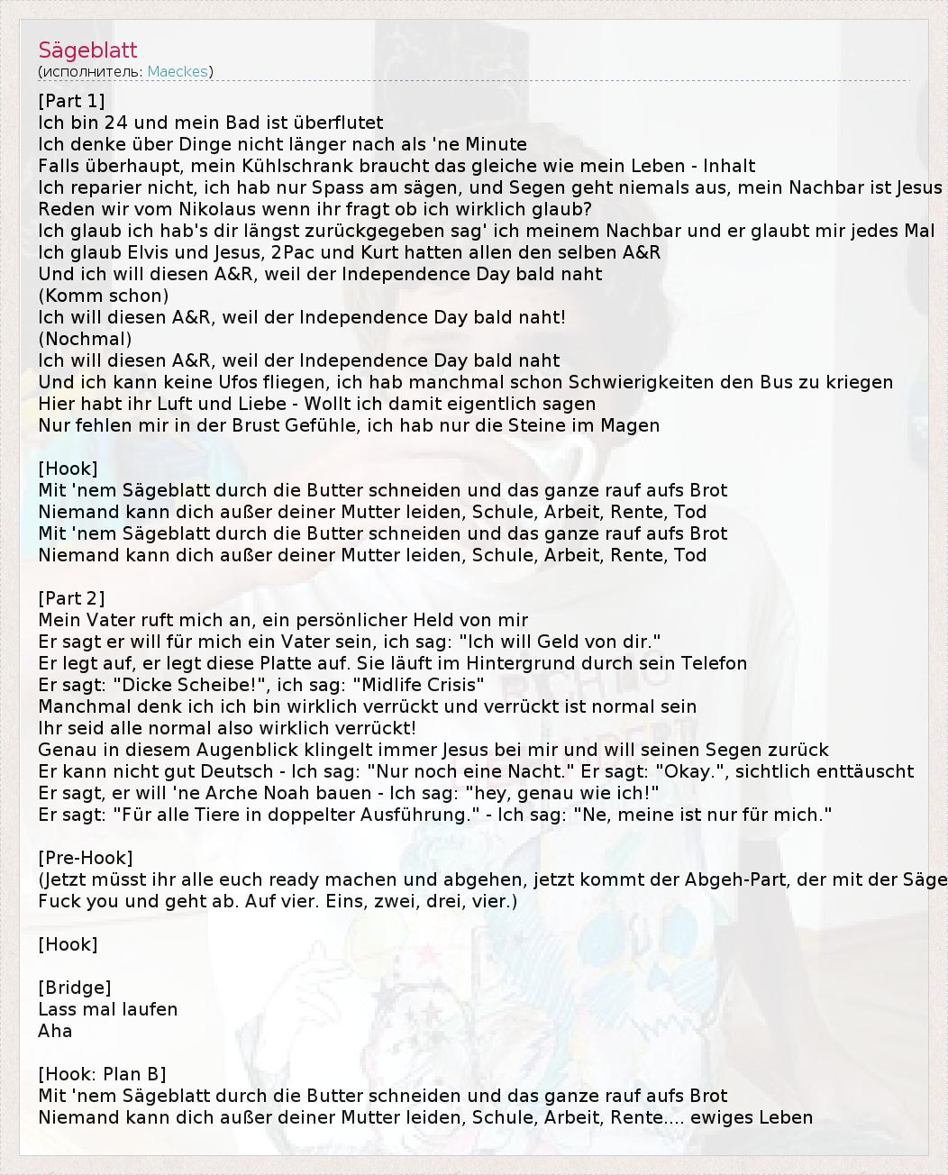 [Part 1] Ich bin 24 und mein Bad ist überflutet Ich denke über Dinge nicht länger nach als 'ne Minute Falls überhaupt, mein Kühlschrank braucht das gleiche wie mein Leben - Inhalt Ich reparier nicht, ich hab nur Spass am sägen, und Segen geht niemals aus, mein Nachbar ist Jesus Reden wir vom Nikolaus wenn ihr fragt ob ich wirklich glaub? Ich glaub ich hab's dir längst zurückgegeben sag' ich meinem Nachbar und er glaubt mir jedes Mal Ich glaub Elvis und Jesus, 2Pac und Kurt hatten allen den selben A&R Und ich will diesen A&R, weil der Independence Day bald naht (Komm schon) Ich will diesen A&R, weil der Independence Day bald naht! (Nochmal) Ich will diesen A&R, weil der Independence Day bald naht Und ich kann keine Ufos fliegen, ich hab manchmal schon Schwierigkeiten den Bus zu kriegen Hier habt ihr Luft und Liebe - Wollt ich damit eigentlich sagen Nur fehlen mir in der Brust Gefühle, ich hab nur die Steine im Magen [Hook] Mit 'nem Sägeblatt durch die Butter schneiden und das ganze rauf aufs Brot Niemand kann dich außer deiner Mutter leiden, Schule, Arbeit, Rente, Tod Mit 'nem Sägeblatt durch die Butter schneiden und das ganze rauf aufs Brot Niemand kann dich außer deiner Mutter leiden, Schule, Arbeit, Rente, Tod [Part 2] Mein Vater ruft mich an, ein persönlicher Held von mir Er sagt er will für mich ein Vater sein, ich sag: "Ich will Geld von dir." Er legt auf, er legt diese Platte auf. Sie läuft im Hintergrund durch sein Telefon Er sagt: "Dicke Scheibe!", ich sag: "Midlife Crisis" Manchmal denk ich ich bin wirklich verrückt und verrückt ist normal sein Ihr seid alle normal also wirklich verrückt! Genau in diesem Augenblick klingelt immer Jesus bei mir und will seinen Segen zurück Er kann nicht gut Deutsch - Ich sag: "Nur noch eine Nacht." Er sagt: "Okay.", sichtlich enttäuscht Er sagt, er will 'ne Arche Noah bauen - Ich sag: "hey, genau wie ich!" Er sagt: "Für alle Tiere in doppelter Ausführung." - Ich sag: "Ne, meine ist nur für mich." [Pre-Hook] (Jetzt müsst ihr alle euch ready machen und abgehen, jetzt kommt der Abgeh-Part, der mit der Säge Fuck you und geht ab. Auf vier. Eins, zwei, drei, vier.) [Hook] [Bridge] Lass mal laufen Aha [Hook: Plan B] Mit 'nem Sägeblatt durch die Butter schneiden und das ganze rauf aufs Brot Niemand kann dich außer deiner Mutter leiden, Schule, Arbeit, Rente.... ewiges Leben