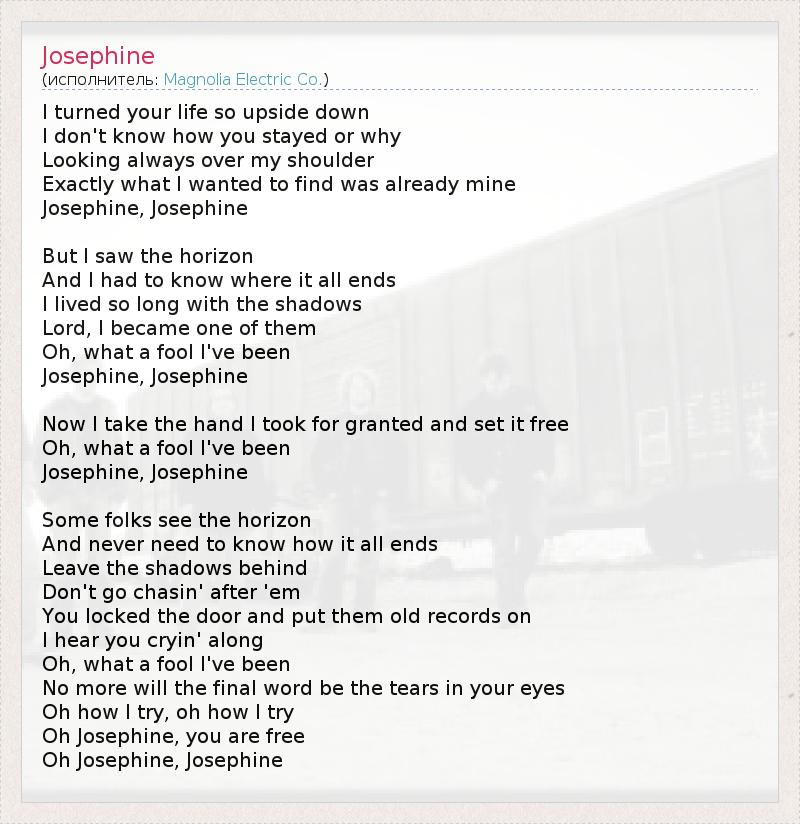 I turned your life so upside down I don't know how you stayed or why Looking always over my shoulder Exactly what I wanted to find was already mine Josephine, Josephine But I saw the horizon And I had to know where it all ends I lived so long with the shadows Lord, I became one of them Oh, what a fool I've been Josephine, Josephine Now I take the hand I took for granted and set it free Oh, what a fool I've been Josephine, Josephine Some folks see the horizon And never need to know how it all ends Leave the shadows behind Don't go chasin' after 'em You locked the door and put them old records on I hear you cryin' along Oh, what a fool I've been No more will the final word be the tears in your eyes Oh how I try, oh how I try Oh Josephine, you are free Oh Josephine, Josephine