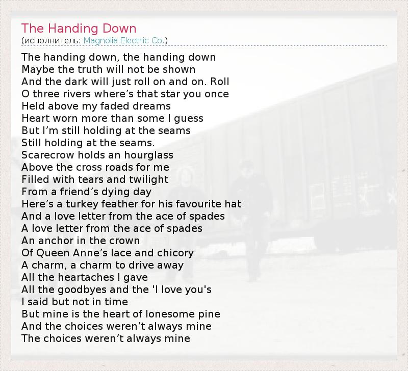Передача вниз,вручая вниз Может быть, правда, не будет показан Итемно просто катиться дальше и дальше . рулон O три реки , где , что вы когда-то звезда Проводится выше моих выцветших мечты Сердце носить больше, чем некоторые я думаю, Но я все еще держа по швам Все еще держа по швам . Пугало держит песочные часы Над перекрестке для меня Наполнились слезами, и сумерки Из последнего днядруга Вотиндейки перо для своей любимой шляпе Илюбовное письмо от туза пик Любовное письмо от туза пик Якорь в короне Кружева и цикория королевы Анны Обаяние, очарование, чтобы отогнать Все страдания, которые я дал Все прощания и«Я люблю тебя это Я сказал , но не во времени Но меня этосердце одинокого сосны И выбор не всегда моя Выбор не всегда моя