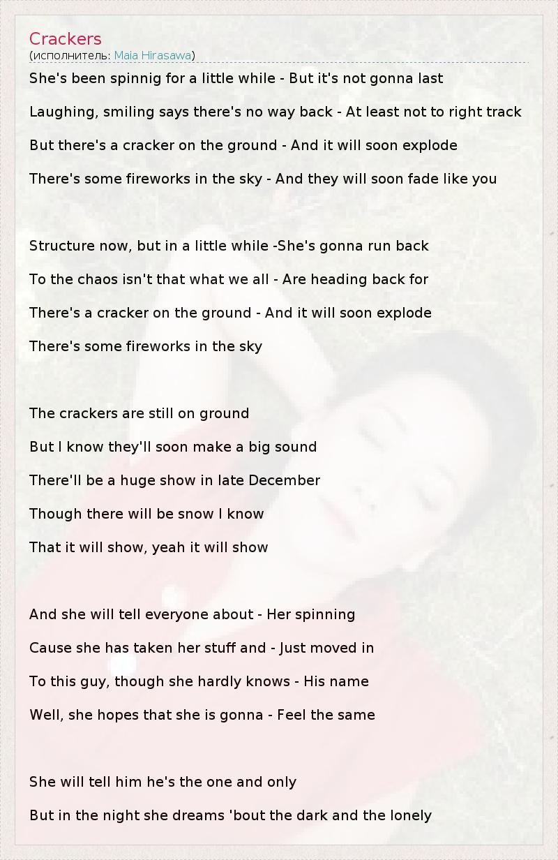 She's been spinnig for a little while - But it's not gonna last Laughing, smiling says there's no way back - At least not to right track But there's a cracker on the ground - And it will soon explode There's some fireworks in the sky - And they will soon fade like you Structure now, but in a little while -She's gonna run back To the chaos isn't that what we all - Are heading back for There's a cracker on the ground - And it will soon explode There's some fireworks in the sky The crackers are still on ground But I know they'll soon make a big sound There'll be a huge show in late December Though there will be snow I know That it will show, yeah it will show And she will tell everyone about - Her spinning Cause she has taken her stuff and - Just moved in To this guy, though she hardly knows - His name Well, she hopes that she is gonna - Feel the same She will tell him he's the one and only But in the night she dreams 'bout the dark and the lonely