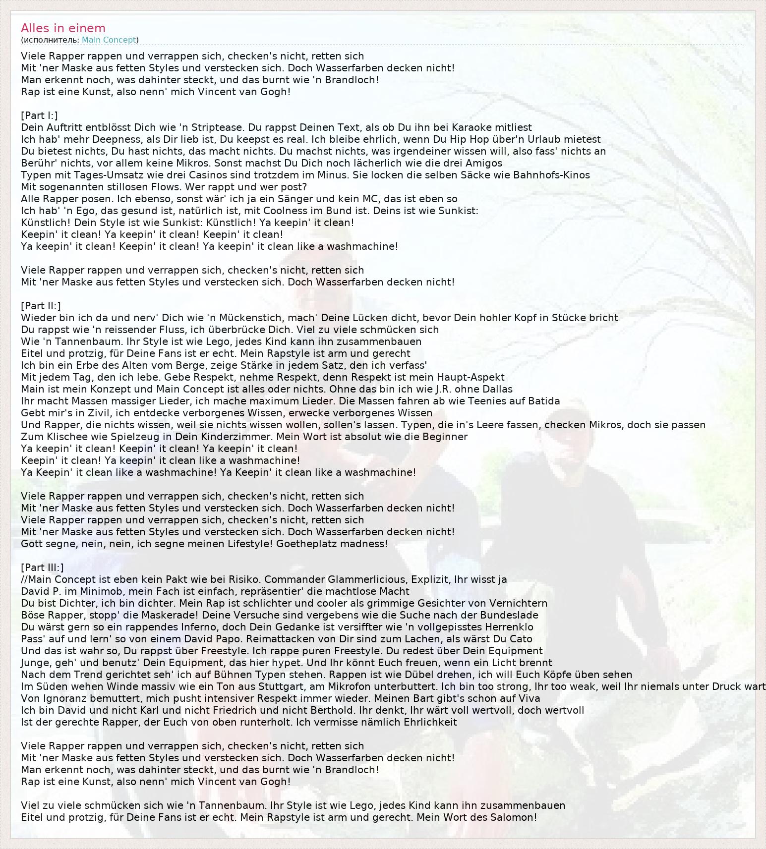 Viele Rapper rappen und verrappen sich, checken's nicht, retten sich Mit 'ner Maske aus fetten Styles und verstecken sich. Doch Wasserfarben decken nicht! Man erkennt noch, was dahinter steckt, und das burnt wie 'n Brandloch! Rap ist eine Kunst, also nenn' mich Vincent van Gogh! [Part I:] Dein Auftritt entblösst Dich wie 'n Striptease. Du rappst Deinen Text, als ob Du ihn bei Karaoke mitliest Ich hab' mehr Deepness, als Dir lieb ist, Du keepst es real. Ich bleibe ehrlich, wenn Du Hip Hop über'n Urlaub mietest Du bietest nichts, Du hast nichts, das macht nichts. Du machst nichts, was irgendeiner wissen will, also fass' nichts an Berühr' nichts, vor allem keine Mikros. Sonst machst Du Dich noch lächerlich wie die drei Amigos Typen mit Tages-Umsatz wie drei Casinos sind trotzdem im Minus. Sie locken die selben Säcke wie Bahnhofs-Kinos Mit sogenannten stillosen Flows. Wer rappt und wer post? Alle Rapper posen. Ich ebenso, sonst wär' ich ja ein Sänger und kein MC, das ist eben so Ich hab' 'n Ego, das gesund ist, natürlich ist, mit Coolness im Bund ist. Deins ist wie Sunkist: Künstlich! Dein Style ist wie Sunkist: Künstlich! Ya keepin' it clean! Keepin' it clean! Ya keepin' it clean! Keepin' it clean! Ya keepin' it clean! Keepin' it clean! Ya keepin' it clean like a washmachine! Viele Rapper rappen und verrappen sich, checken's nicht, retten sich Mit 'ner Maske aus fetten Styles und verstecken sich. Doch Wasserfarben decken nicht! [Part II:] Wieder bin ich da und nerv' Dich wie 'n Mückenstich, mach' Deine Lücken dicht, bevor Dein hohler Kopf in Stücke bricht Du rappst wie 'n reissender Fluss, ich überbrücke Dich. Viel zu viele schmücken sich Wie 'n Tannenbaum. Ihr Style ist wie Lego, jedes Kind kann ihn zusammenbauen Eitel und protzig, für Deine Fans ist er echt. Mein Rapstyle ist arm und gerecht Ich bin ein Erbe des Alten vom Berge, zeige Stärke in jedem Satz, den ich verfass' Mit jedem Tag, den ich lebe. Gebe Respekt, nehme Respekt, denn Respekt ist mein Haupt-Aspekt Main ist mein Konzept und Main Concept ist alles oder nichts. Ohne das bin ich wie J.R. ohne Dallas Ihr macht Massen massiger Lieder, ich mache maximum Lieder. Die Massen fahren ab wie Teenies auf Batida Gebt mir's in Zivil, ich entdecke verborgenes Wissen, erwecke verborgenes Wissen Und Rapper, die nichts wissen, weil sie nichts wissen wollen, sollen's lassen. Typen, die in's Leere fassen, checken Mikros, doch sie passen Zum Klischee wie Spielzeug in Dein Kinderzimmer. Mein Wort ist absolut wie die Beginner Ya keepin' it clean! Keepin' it clean! Ya keepin' it clean! Keepin' it clean! Ya keepin' it clean like a washmachine! Ya Keepin' it clean like a washmachine! Ya Keepin' it clean like a washmachine! Viele Rapper rappen und verrappen sich, checken's nicht, retten sich Mit 'ner Maske aus fetten Styles und verstecken sich. Doch Wasserfarben decken nicht! Viele Rapper rappen und verrappen sich, checken's nicht, retten sich Mit 'ner Maske aus fetten Styles und verstecken sich. Doch Wasserfarben decken nicht! Gott segne, nein, nein, ich segne meinen Lifestyle! Goetheplatz madness! [Part III:] //Main Concept ist eben kein Pakt wie bei Risiko. Commander Glammerlicious, Explizit, Ihr wisst ja David P. im Minimob, mein Fach ist einfach, repräsentier' die machtlose Macht Du bist Dichter, ich bin dichter. Mein Rap ist schlichter und cooler als grimmige Gesichter von Vernichtern Böse Rapper, stopp' die Maskerade! Deine Versuche sind vergebens wie die Suche nach der Bundeslade Du wärst gern so ein rappendes Inferno, doch Dein Gedanke ist versiffter wie 'n vollgepisstes Herrenklo Pass' auf und lern' so von einem David Papo. Reimattacken von Dir sind zum Lachen, als wärst Du Cato Und das ist wahr so, Du rappst über Freestyle. Ich rappe puren Freestyle. Du redest über Dein Equipment Junge, geh' und benutz' Dein Equipment, das hier hypet. Und Ihr könnt Euch freuen, wenn ein Licht brennt Nach dem Trend gerichtet seh' ich auf Bühnen Typen stehen. Rappen ist wie Dübel drehen, ich will Euch Köpfe üben sehen Im Süden wehen Winde massiv wie ein Ton aus Stuttgart, am Mikrofon unterbuttert. Ich bin too strong, Ihr too weak, weil Ihr niemals unter Druck wart Von Ignoranz bemuttert, mich pusht intensiver Respekt immer wieder. Meinen Bart gibt's schon auf Viva Ich bin David und nicht Karl und nicht Friedrich und nicht Berthold. Ihr denkt, Ihr wärt voll wertvoll, doch wertvoll Ist der gerechte Rapper, der Euch von oben runterholt. Ich vermisse nämlich Ehrlichkeit Viele Rapper rappen und verrappen sich, checken's nicht, retten sich Mit 'ner Maske aus fetten Styles und verstecken sich. Doch Wasserfarben decken nicht! Man erkennt noch, was dahinter steckt, und das burnt wie 'n Brandloch! Rap ist eine Kunst, also nenn' mich Vincent van Gogh! Viel zu viele schmücken sich wie 'n Tannenbaum. Ihr Style ist wie Lego, jedes Kind kann ihn zusammenbauen Eitel und protzig, für Deine Fans ist er echt. Mein Rapstyle ist arm und gerecht. Mein Wort des Salomon!