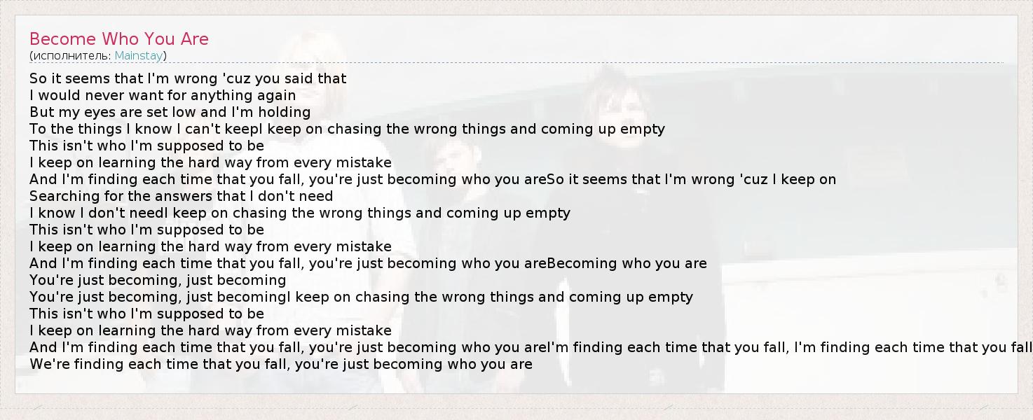 Это интересно:Mainstay is a melodic rock band from Minneapolis, Minnesota. The band was formed in 2003 and is signed to BEC Recordings. While a lot of the band's music has decidedly Christian lyrics and messages, their music appeals to a large secular fanbase as well. Their music style has been compared to Copeland, Kutless, Sanctus Real, Lifehouse and The Goo Goo Dolls. Their debut album, Well Meaning Fiction, was released on February 21, 2006.