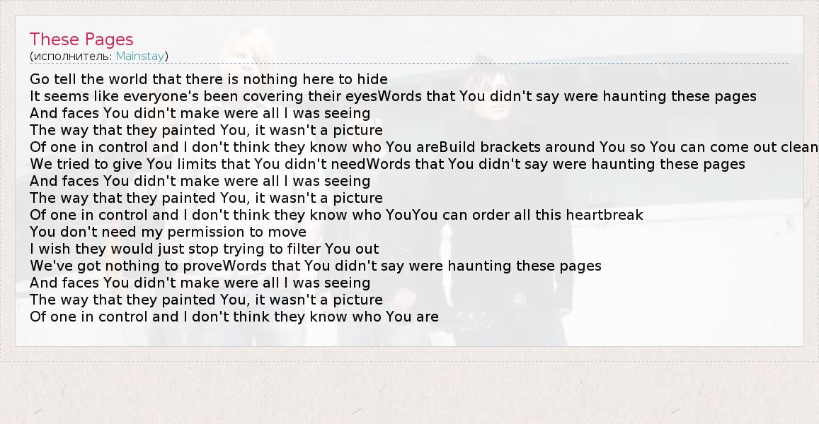 Это интересно:Mainstay is a melodic rock band from Minneapolis, Minnesota. The band was formed in 2003 and is signed to BEC Recordings. While a lot of the band's music has decidedly Christian lyrics and messages, their music appeals to a large secular fanbase as well. Their music style has been compared to Copeland, Kutless, Sanctus Real, Lifehouse and The Goo Goo Dolls. Their debut album, Well Meaning Fiction, was released on February 21, 2006.