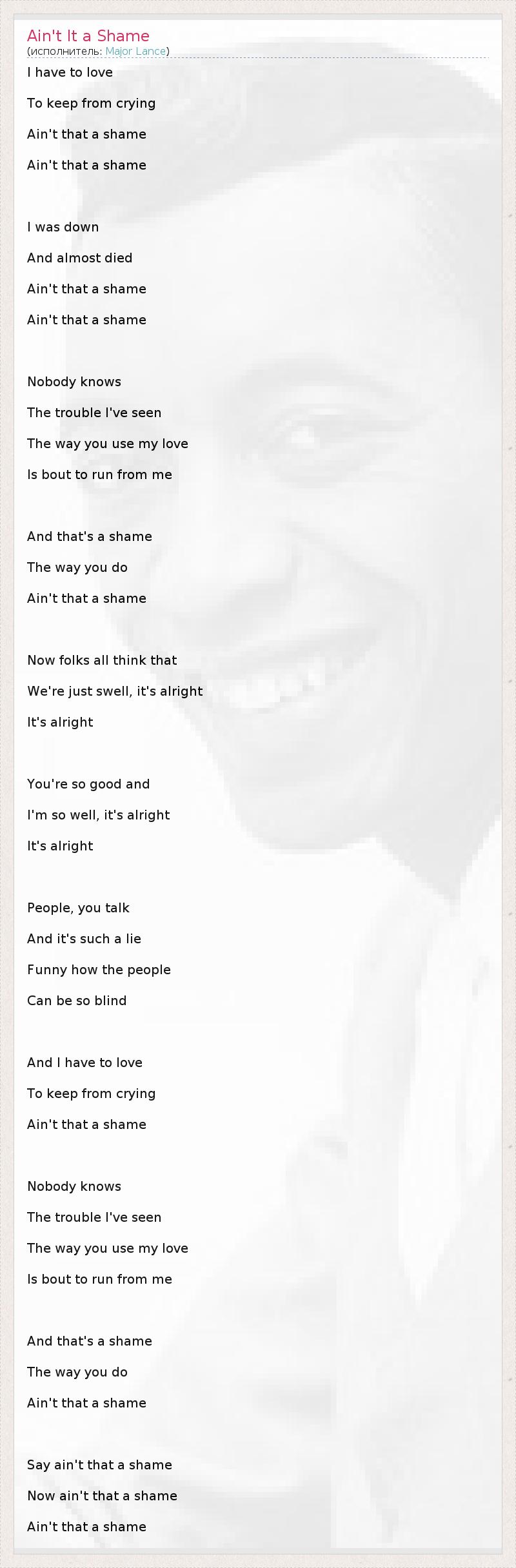 I have to love To keep from crying Ain't that a shame Ain't that a shame I was down And almost died Ain't that a shame Ain't that a shame Nobody knows The trouble I've seen The way you use my love Is bout to run from me And that's a shame The way you do Ain't that a shame Now folks all think that We're just swell, it's alright It's alright You're so good and I'm so well, it's alright It's alright People, you talk And it's such a lie Funny how the people Can be so blind And I have to love To keep from crying Ain't that a shame Nobody knows The trouble I've seen The way you use my love Is bout to run from me And that's a shame The way you do Ain't that a shame Say ain't that a shame Now ain't that a shame Ain't that a shame