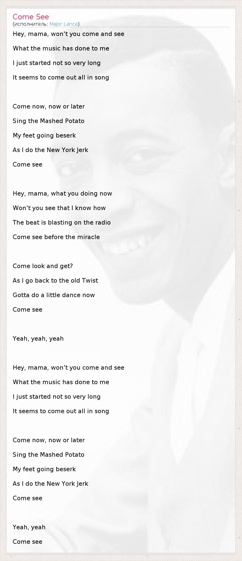 Hey, mama, won't you come and see What the music has done to me I just started not so very long It seems to come out all in song Come now, now or later Sing the Mashed Potato My feet going beserk As I do the New York Jerk Come see Hey, mama, what you doing now Won't you see that I know how The beat is blasting on the radio Come see before the miracle Come look and get? As I go back to the old Twist Gotta do a little dance now Come see Yeah, yeah, yeah Hey, mama, won't you come and see What the music has done to me I just started not so very long It seems to come out all in song Come now, now or later Sing the Mashed Potato My feet going beserk As I do the New York Jerk Come see Yeah, yeah Come see