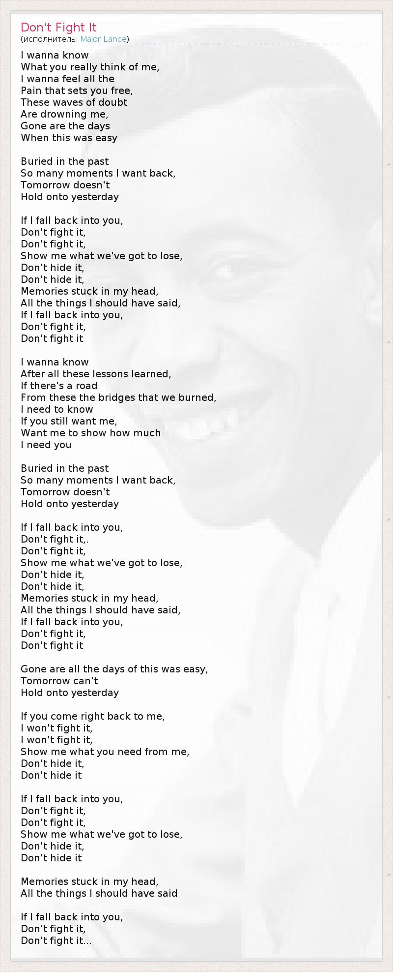Я хочу знать, Что ты действительно думаешь обо мне, Я хочу чувствовать Всю боль, что освобождает тебя, Эти волны сомнений Тянут меня на дно, Прошли те времена, Когда это было легко Все похоронено в прошлом, Так много моментов, что я хочу вернуть, Следующий день Не живёт прошедшим Если я снова полюблю тебя, То не борись с этим, Не борись, Покажи мне, что мы должны потерять, Не прячь это, Не прячь, Воспоминания застряли в моей голове, Все те вещи, что я должен был сказать тебе, Если я снова полюблю тебя, Не борись с этим, Не борись Я хочу знать После всех уроков, что мы извлекли, Есть ли дорога От тех сожжённых нами мостов, Мне нужно знать, Нужен ли я тебе до сих пор, Хочешь ли ты, чтобы я показал тебе, насколько Ты нужна мне Все похоронено в прошлом, Так много моментов, что я хочу вернуть, Следующий день Не живёт прошедшим Если я снова полюблю тебя, То не борись с этим, Не борись, Покажи мне, что мы должны потерять, Не прячь это, Не прячь, Воспоминания застряли в моей голове, Все те вещи, что я должен был сказать тебе, Если я снова полюблю тебя, Не борись с этим, Не борись Прошли те дни, когда было легко, Ведь следующий день Не может жить прошлым Если ты вернёшься ко мне, Я не буду бороться с этим, Не буду бороться, Покажи мне, что тебе нужно от меня, Не прячь это, Не прячь Если я снова полюблю тебя, Не борись с этим, Не борись, Покажи мне, что мы должны потерять, Не прячь это, Не прячь Воспоминания застряли в моей голове, Всё, что я должен был сказать Если я снова полюблю тебя, Не борись с этим, Не борись...