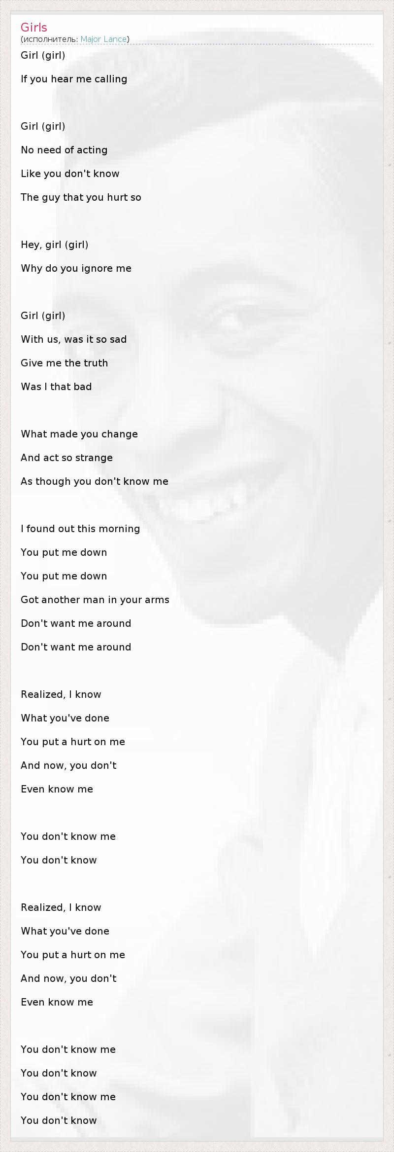 Girl (girl) If you hear me calling Girl (girl) No need of acting Like you don't know The guy that you hurt so Hey, girl (girl) Why do you ignore me Girl (girl) With us, was it so sad Give me the truth Was I that bad What made you change And act so strange As though you don't know me I found out this morning You put me down You put me down Got another man in your arms Don't want me around Don't want me around Realized, I know What you've done You put a hurt on me And now, you don't Even know me You don't know me You don't know Realized, I know What you've done You put a hurt on me And now, you don't Even know me You don't know me You don't know You don't know me You don't know